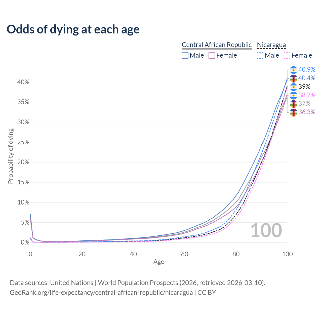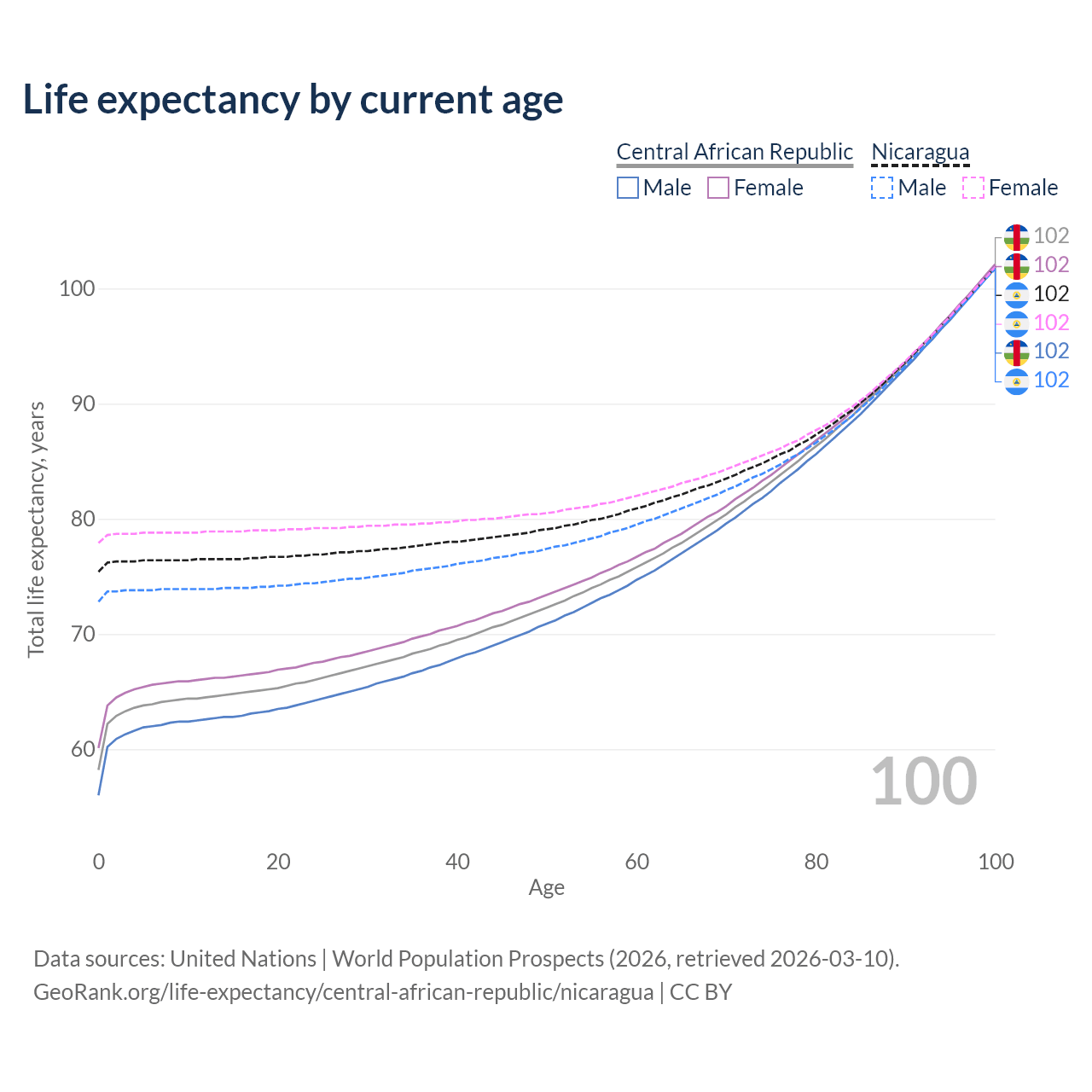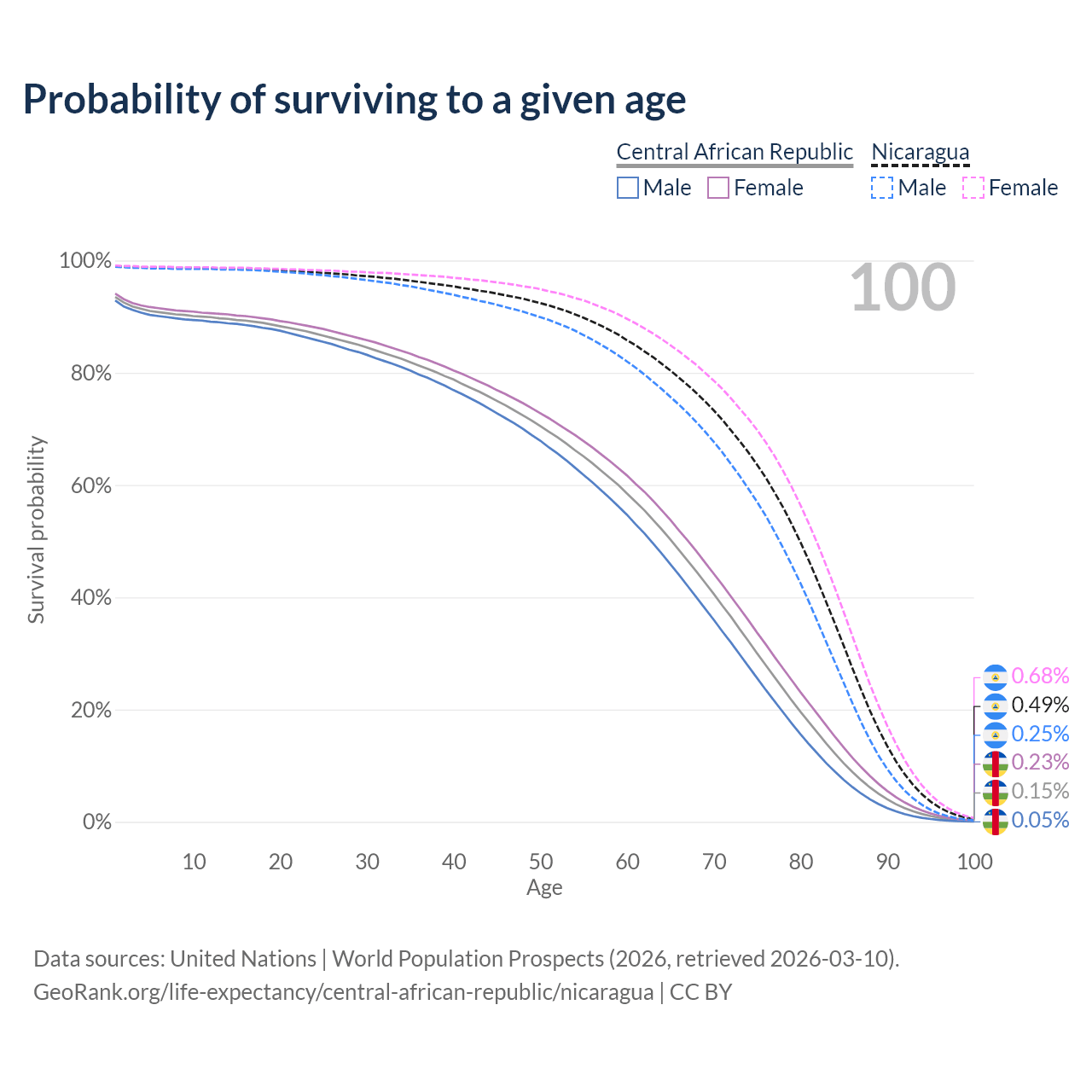 This life expectancy calculator shows the odds of living to 100, 95, 90, and below based on current age for both males and females in the Central African Republic and Nicaragua, along with mean and median age of death. The calculations are based on the 2026 life tables (actuarial tables) from the UN World Population Prospects.