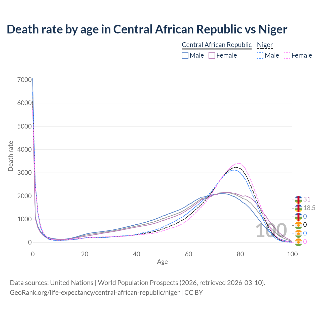 In the Central African Republic, the most common age of death is 0, compared to 0 in Niger. The median age of death is 65.2 in the Central African Republic and 71.7 in Niger, meaning only half of each cohort is expected to live past that age.