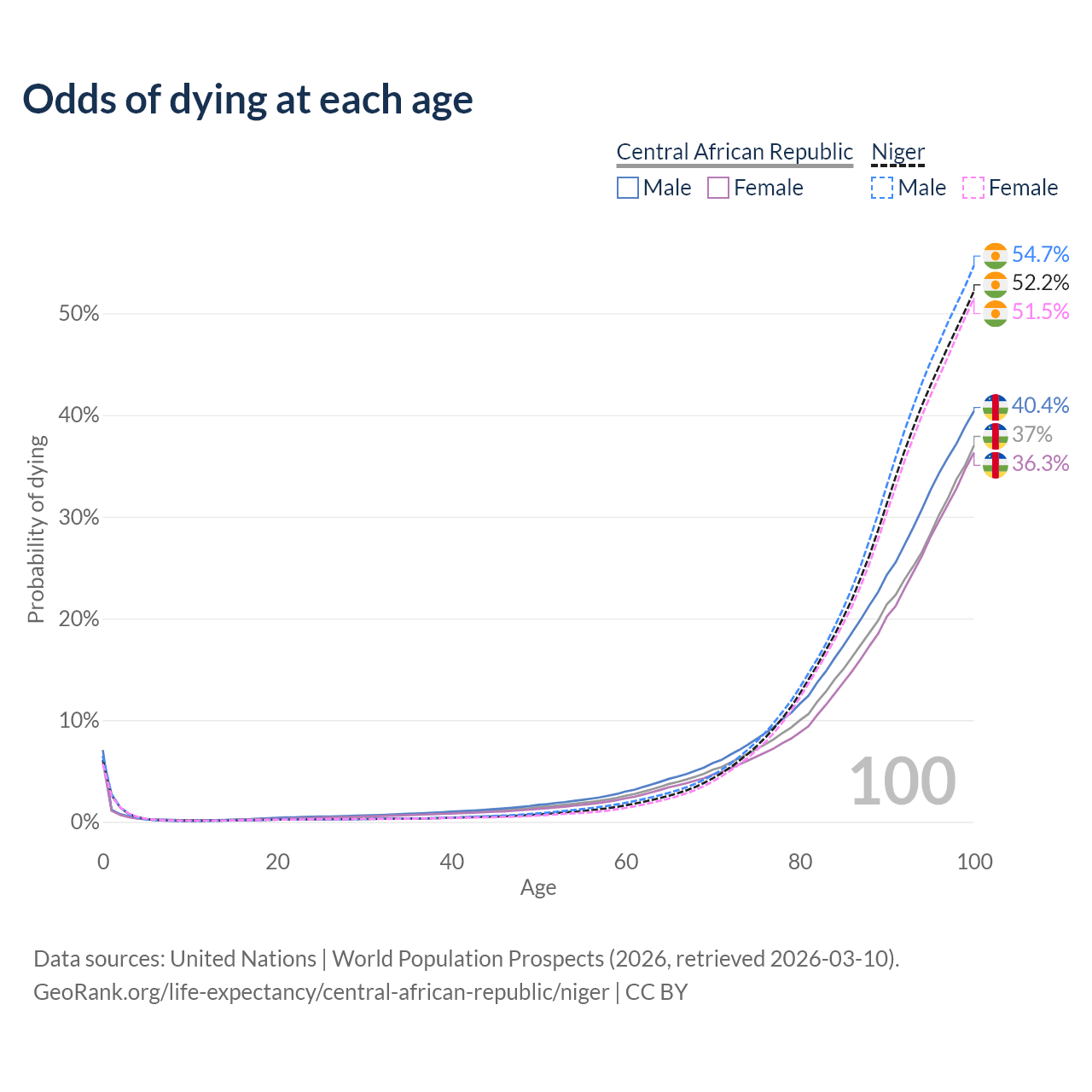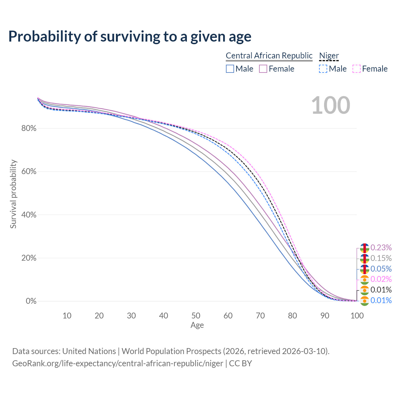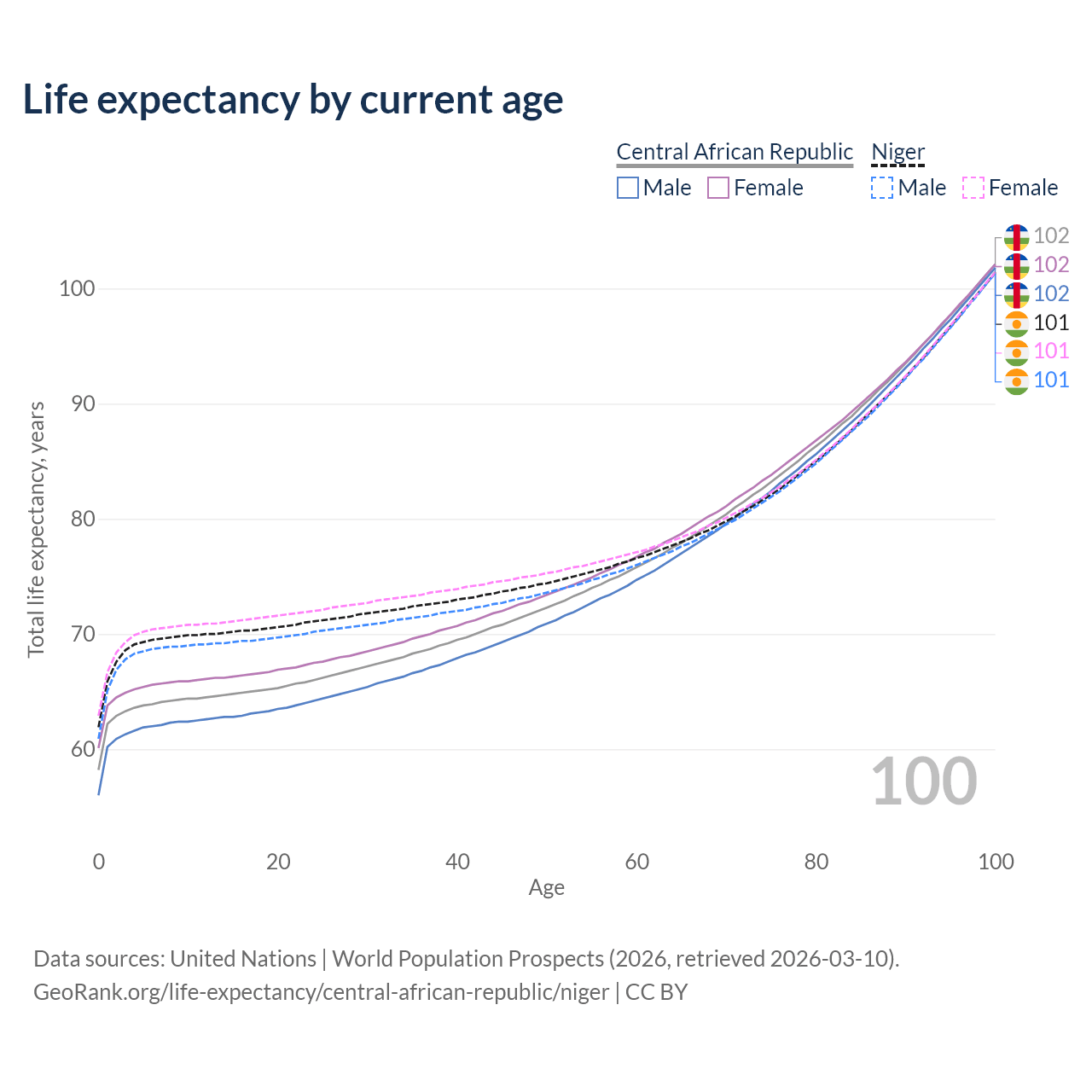 This life expectancy calculator shows the odds of living to 100, 95, 90, and below based on current age for both males and females in the Central African Republic and Niger, along with mean and median age of death. The calculations are based on the 2026 life tables (actuarial tables) from the UN World Population Prospects.