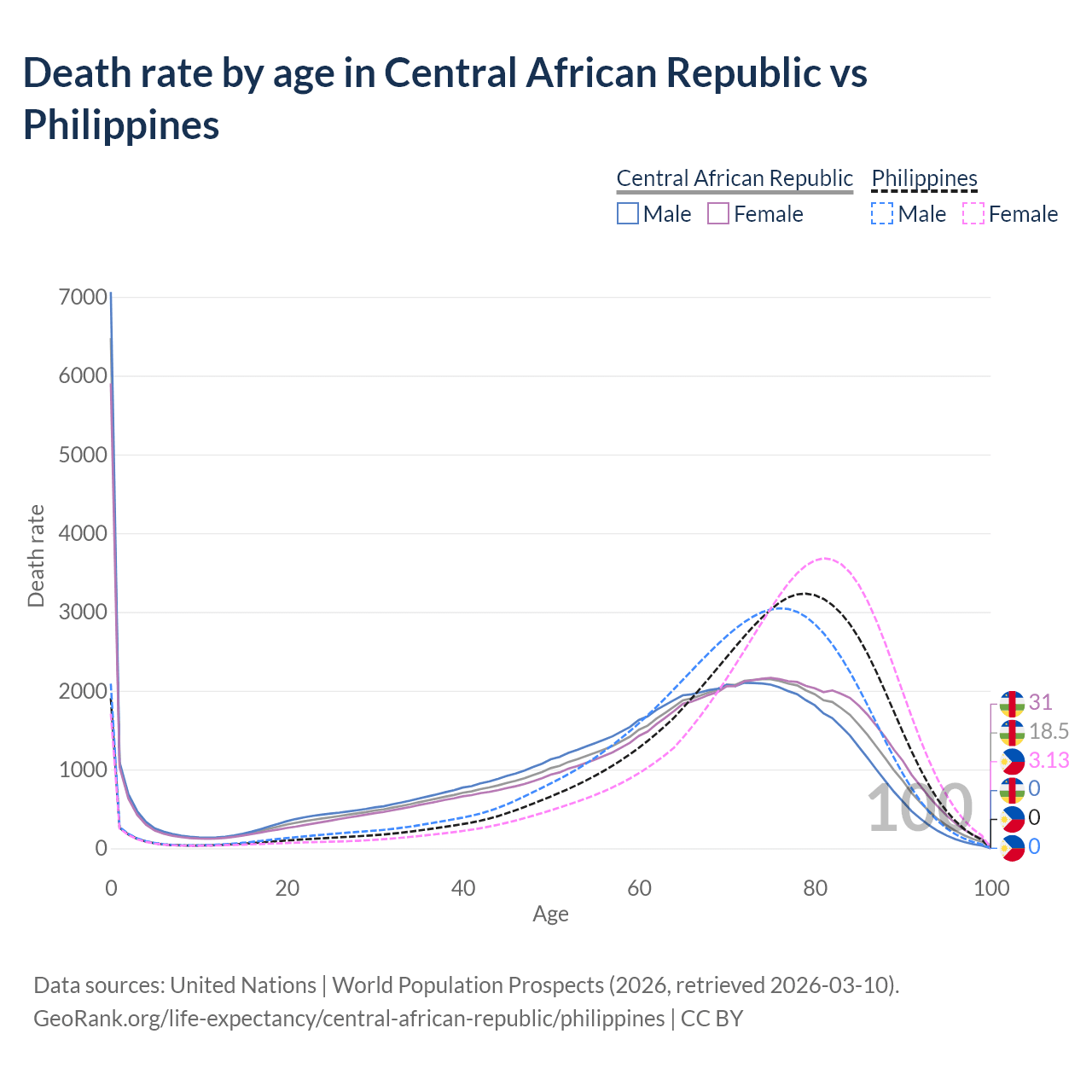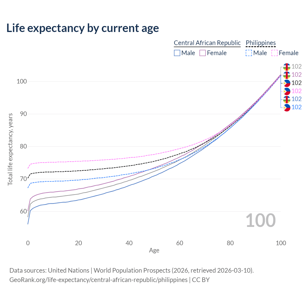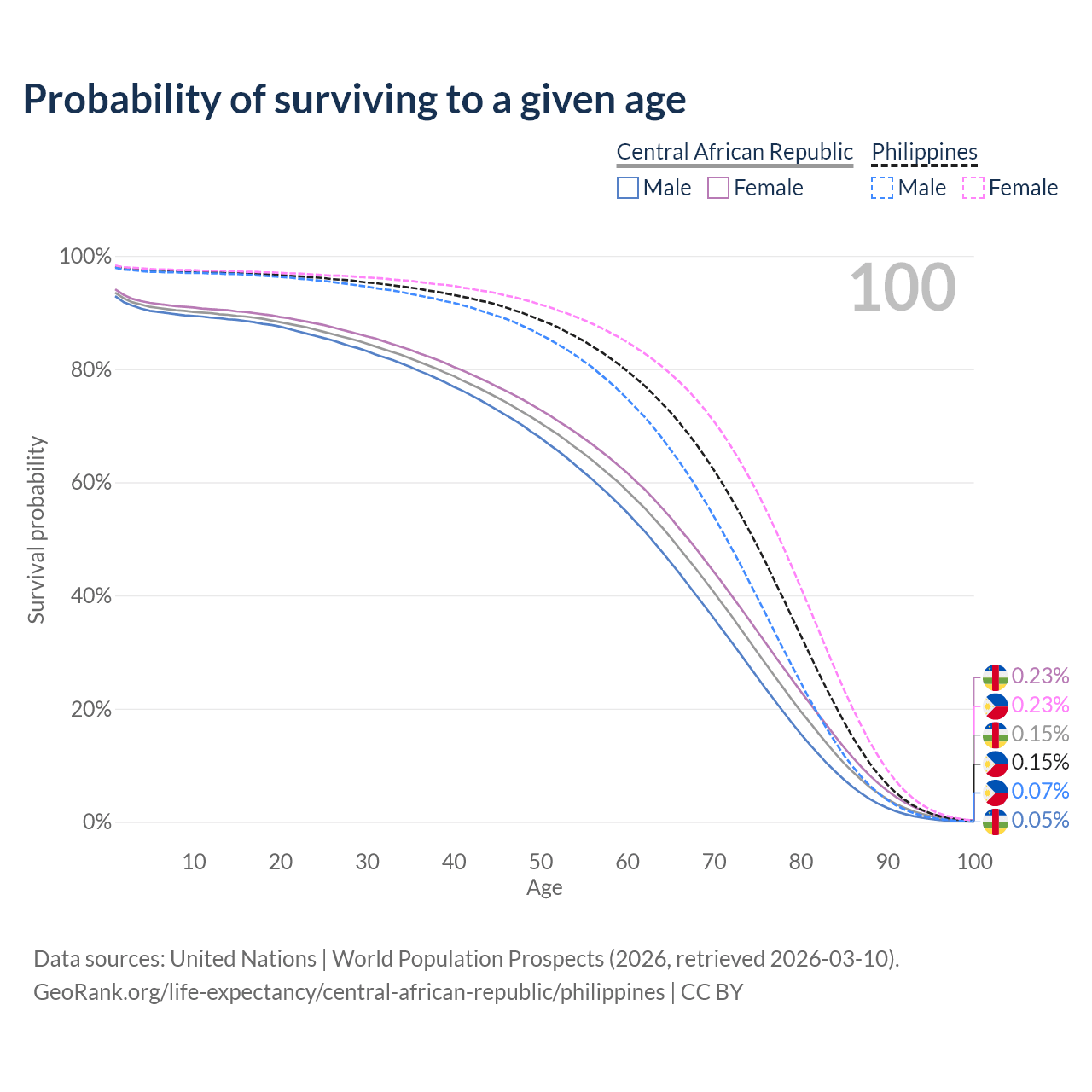 This life expectancy calculator shows the odds of living to 100, 95, 90, and below based on current age for both males and females in the Central African Republic and the Philippines, along with mean and median age of death. The calculations are based on the 2026 life tables (actuarial tables) from the UN World Population Prospects.