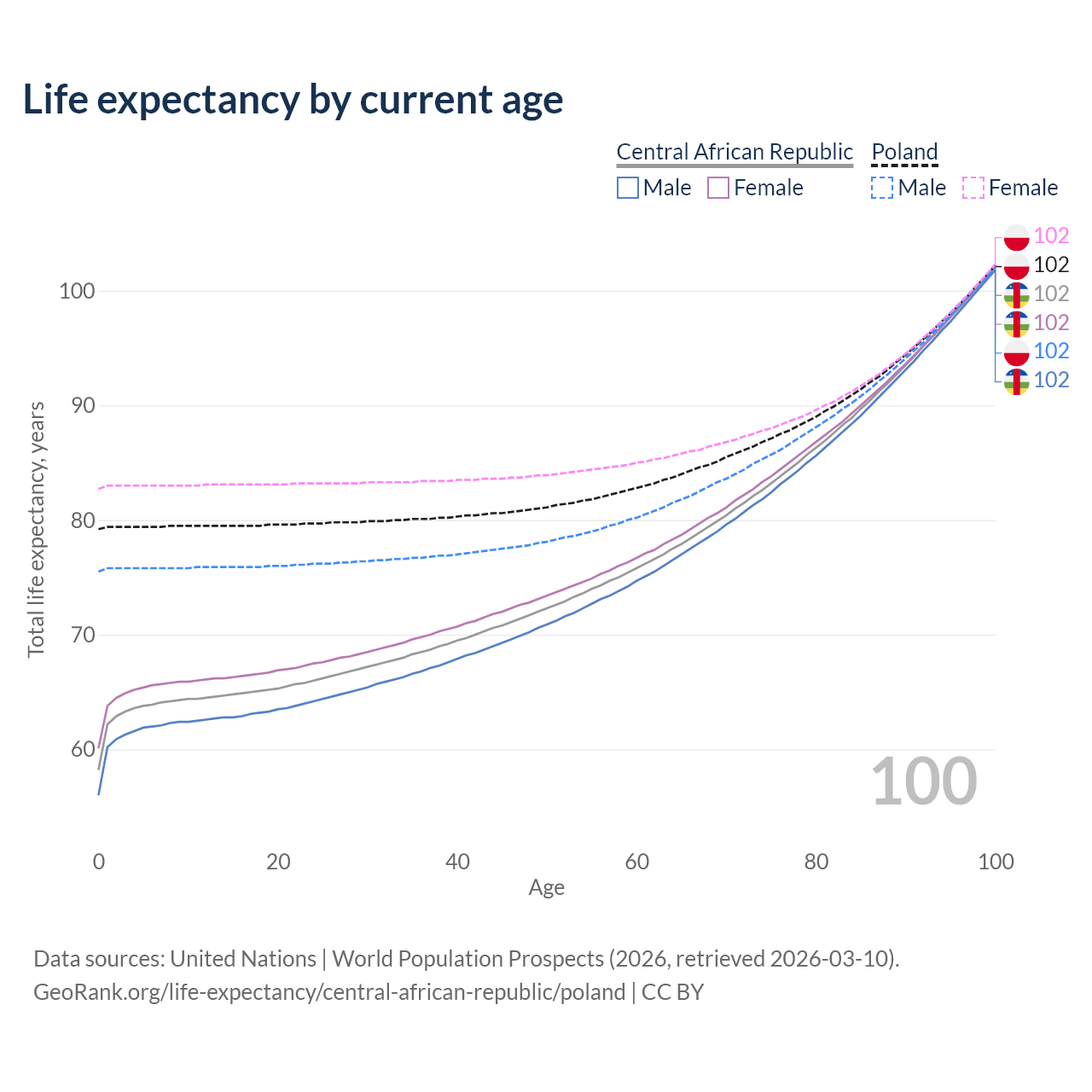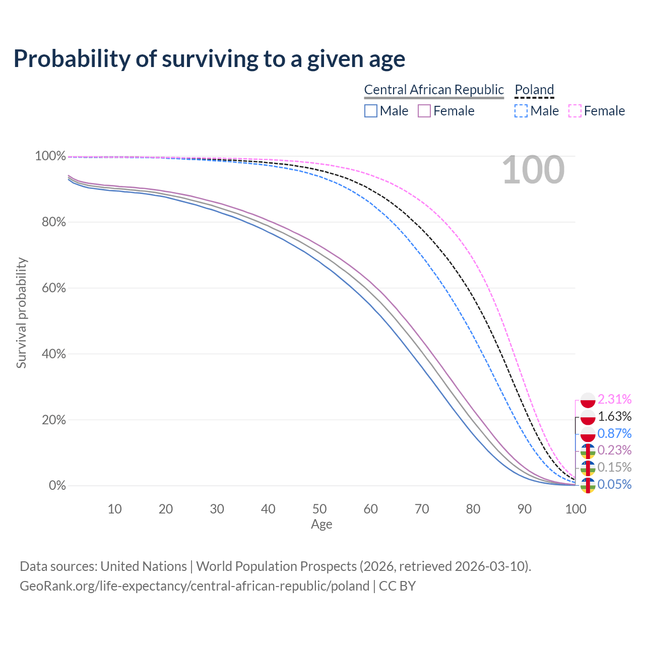 This life expectancy calculator shows the odds of living to 100, 95, 90, and below based on current age for both males and females in the Central African Republic and Poland, along with mean and median age of death. The calculations are based on the 2026 life tables (actuarial tables) from the UN World Population Prospects.