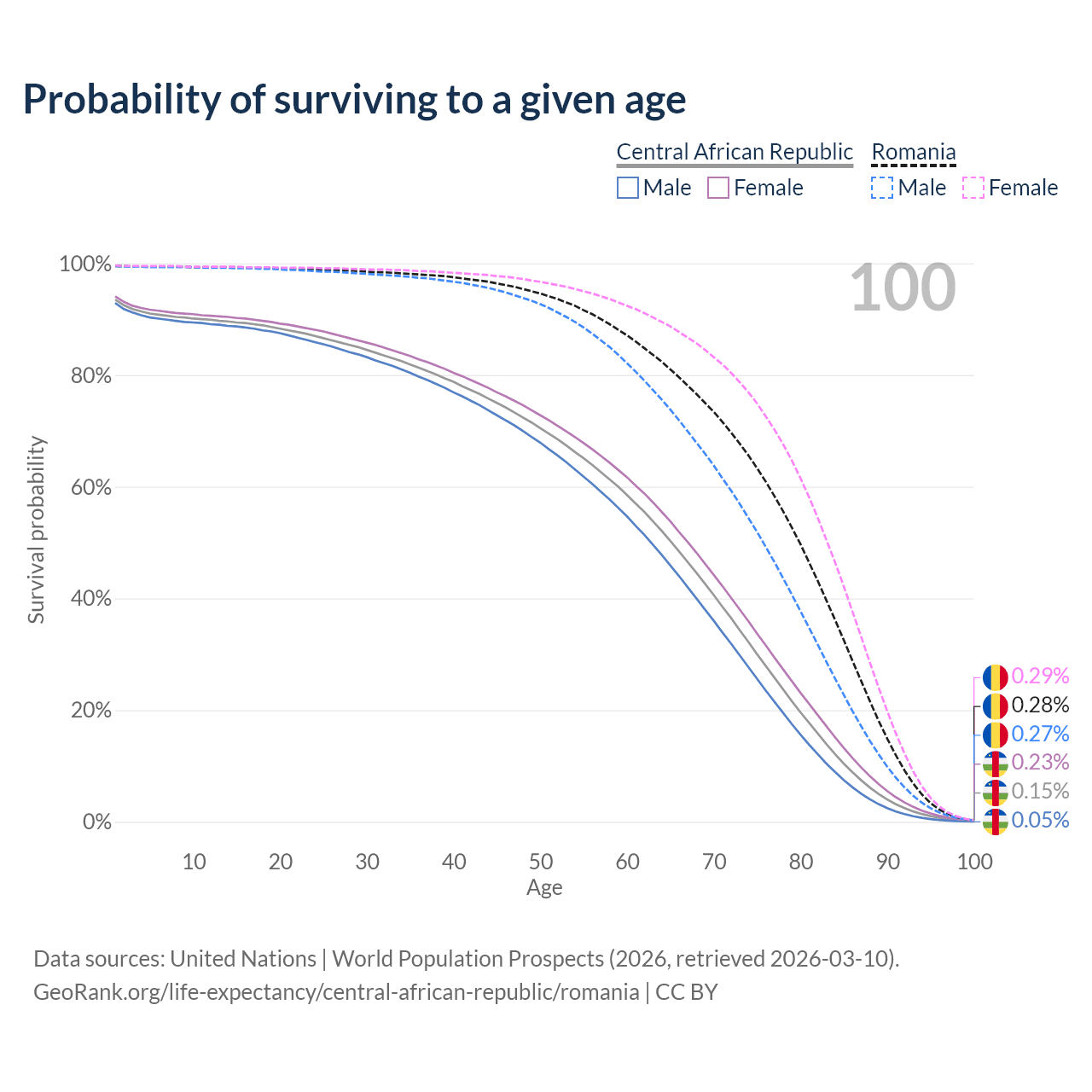 This life expectancy calculator shows the odds of living to 100, 95, 90, and below based on current age for both males and females in the Central African Republic and Romania, along with mean and median age of death. The calculations are based on the 2026 life tables (actuarial tables) from the UN World Population Prospects.