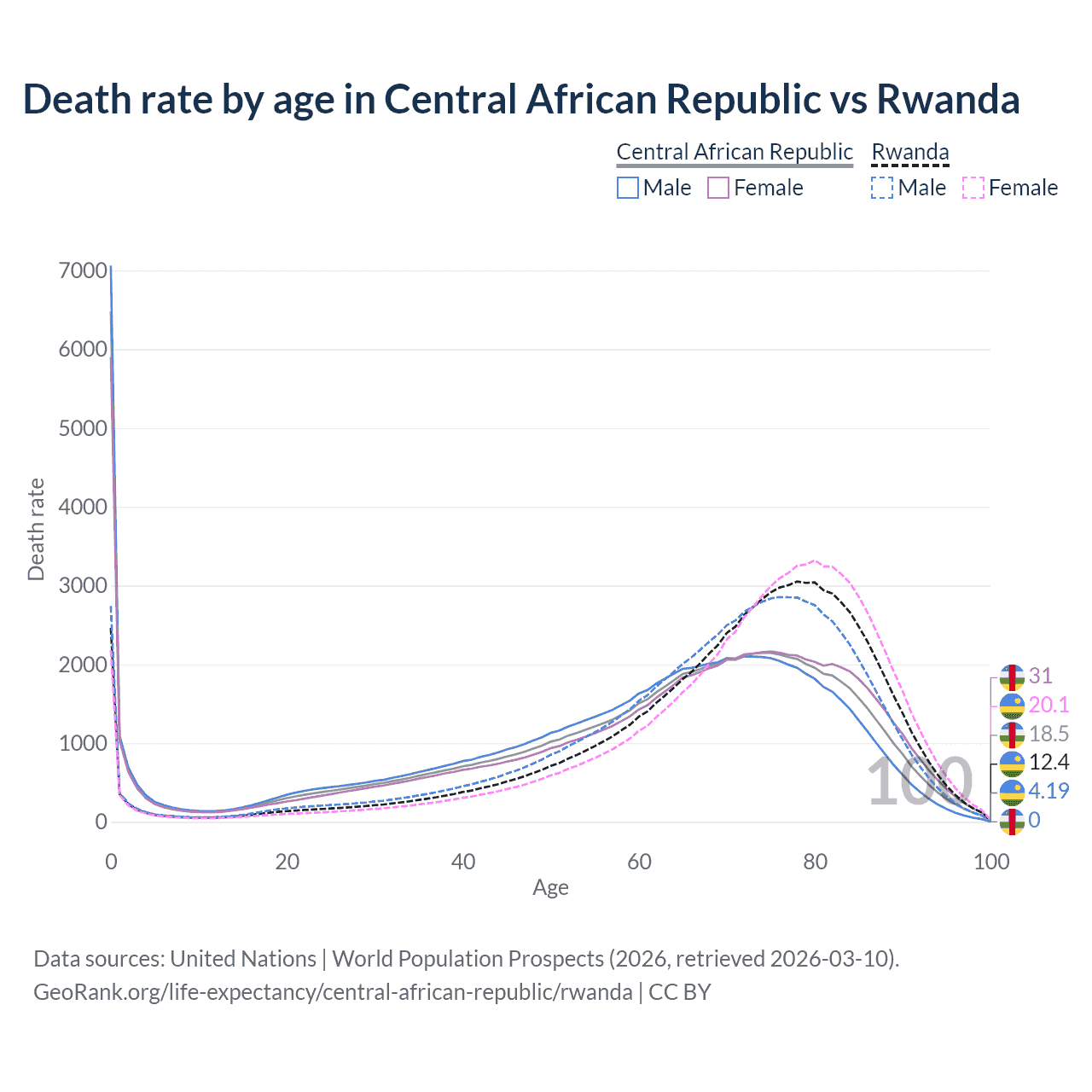 In the Central African Republic, the most common age of death is 0, compared to 78 in Rwanda. The median age of death is 65.2 in the Central African Republic and 73.5 in Rwanda, meaning only half of each cohort is expected to live past that age.