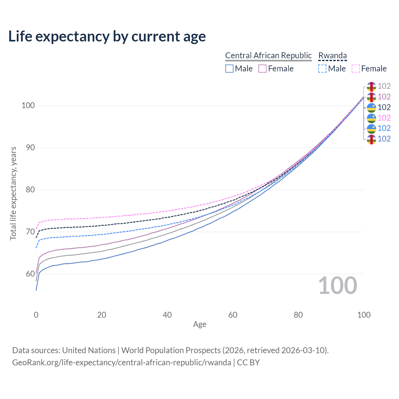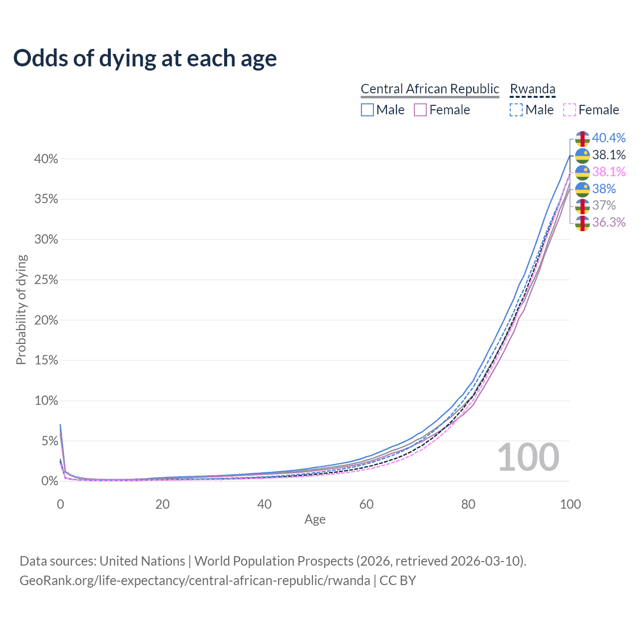 This life expectancy calculator shows the odds of living to 100, 95, 90, and below based on current age for both males and females in the Central African Republic and Rwanda, along with mean and median age of death. The calculations are based on the 2026 life tables (actuarial tables) from the UN World Population Prospects.