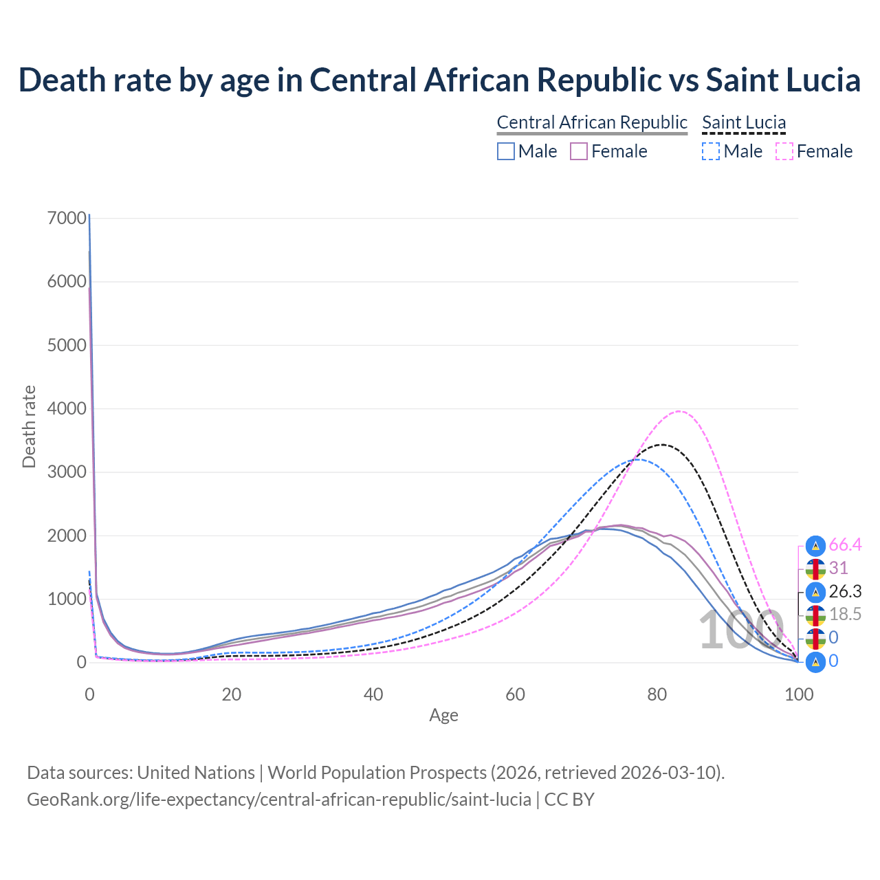 In the Central African Republic, the most common age of death is 0, compared to 81 in Saint Lucia. The median age of death is 65.2 in the Central African Republic and 76.8 in Saint Lucia, meaning only half of each cohort is expected to live past that age.