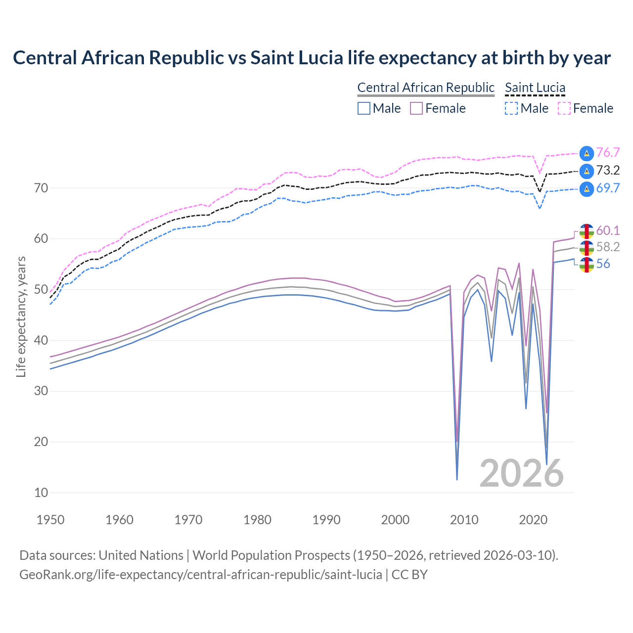GeoRank.org/life-expectancy/central-african-republic/saint-lucia | CC BY