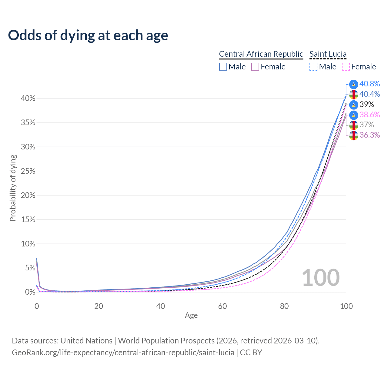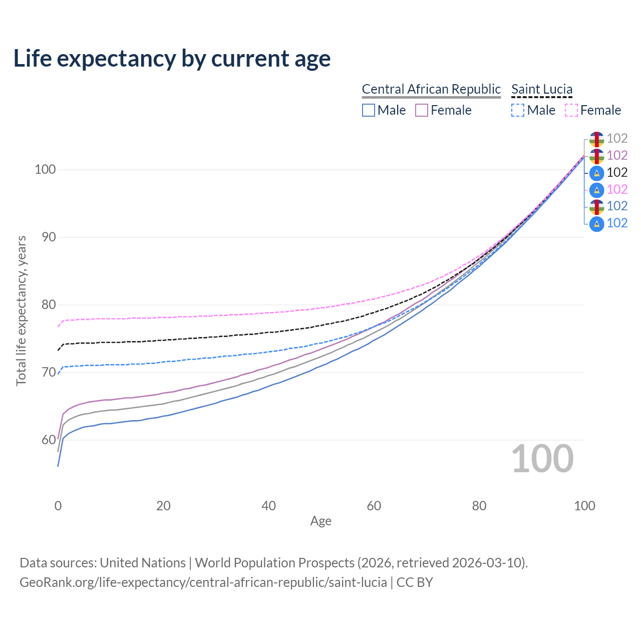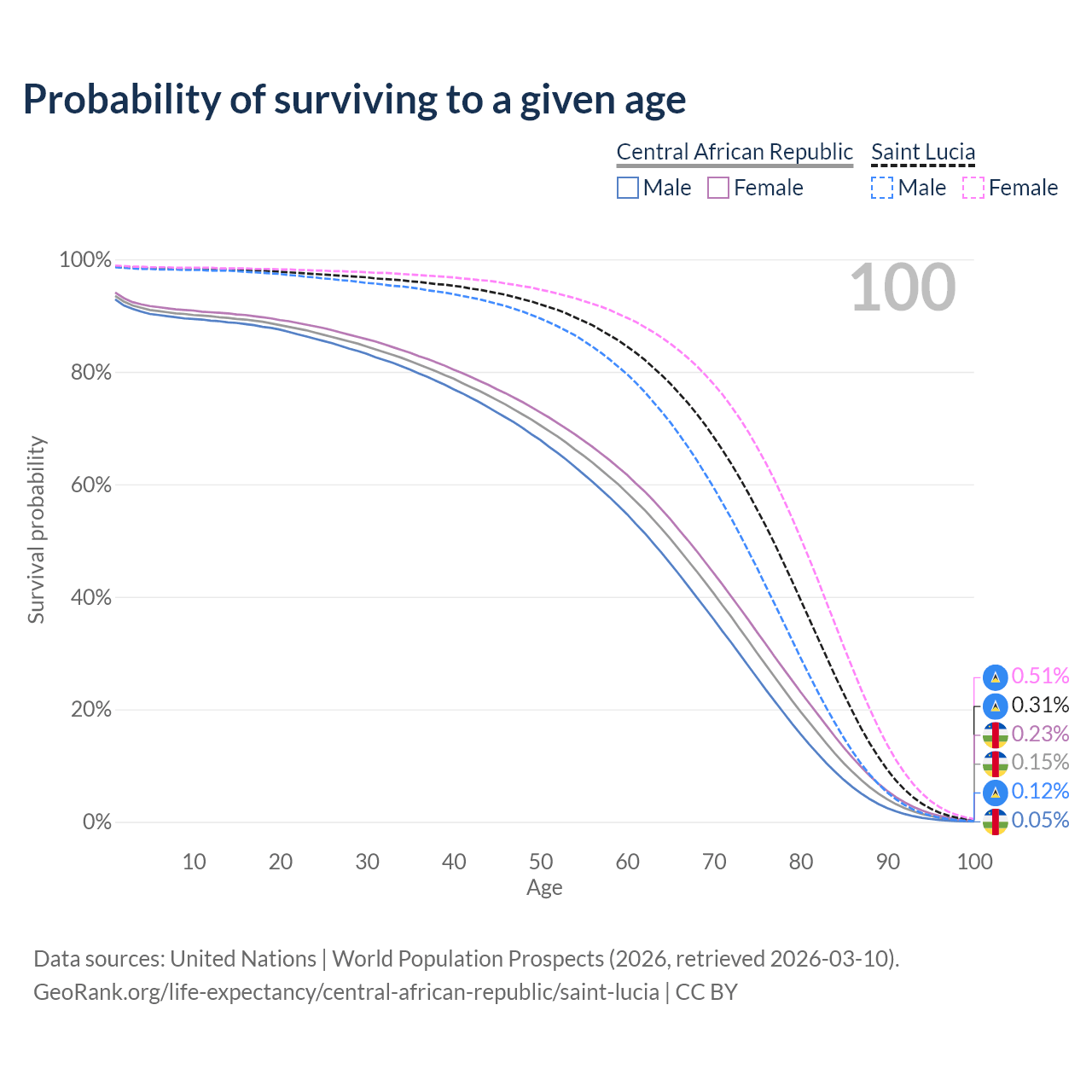 This life expectancy calculator shows the odds of living to 100, 95, 90, and below based on current age for both males and females in the Central African Republic and Saint Lucia, along with mean and median age of death. The calculations are based on the 2026 life tables (actuarial tables) from the UN World Population Prospects.
