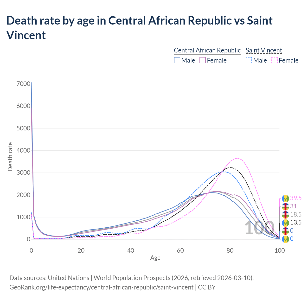 In the Central African Republic, the most common age of death is 0, compared to 80 in Saint Vincent. The median age of death is 65.2 in the Central African Republic and 75.6 in Saint Vincent, meaning only half of each cohort is expected to live past that age.