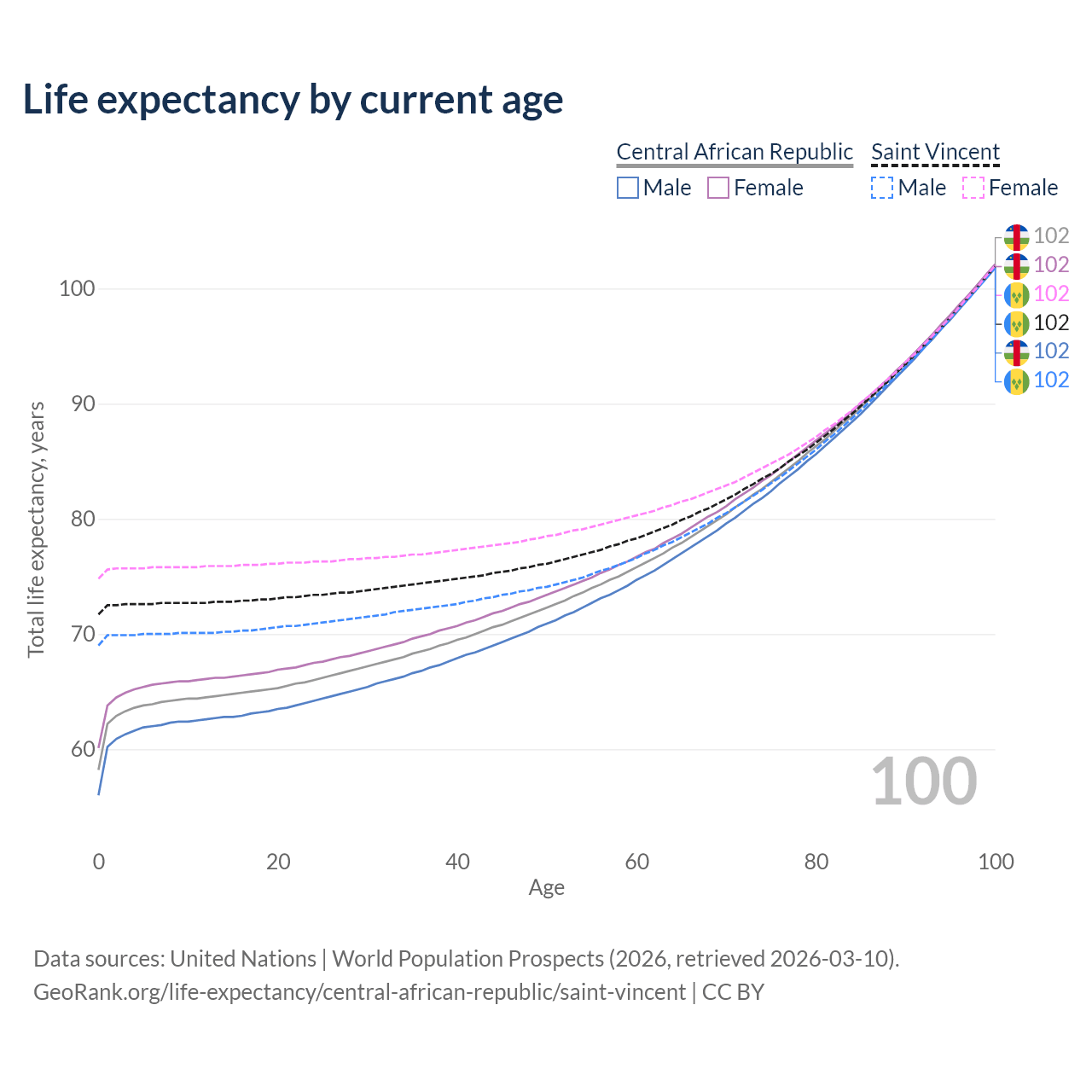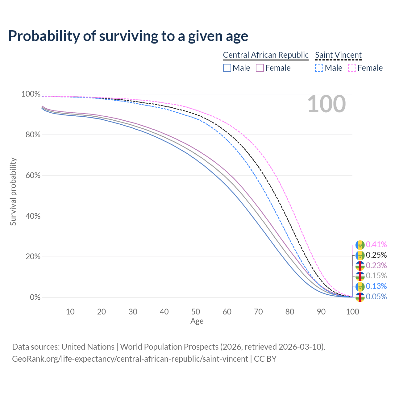 This life expectancy calculator shows the odds of living to 100, 95, 90, and below based on current age for both males and females in the Central African Republic and Saint Vincent, along with mean and median age of death. The calculations are based on the 2026 life tables (actuarial tables) from the UN World Population Prospects.