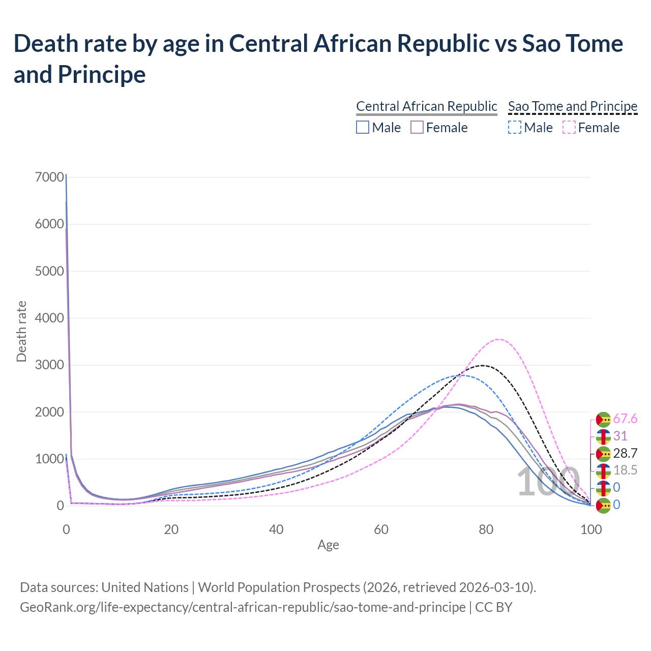 In the Central African Republic, the most common age of death is 0, compared to 79 in Sao Tome and Principe. The median age of death is 65.2 in the Central African Republic and 74.1 in Sao Tome and Principe, meaning only half of each cohort is expected to live past that age.