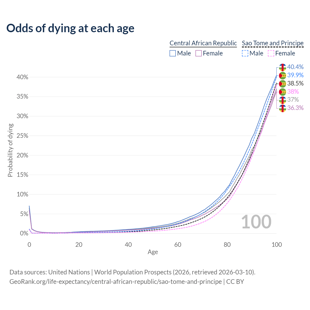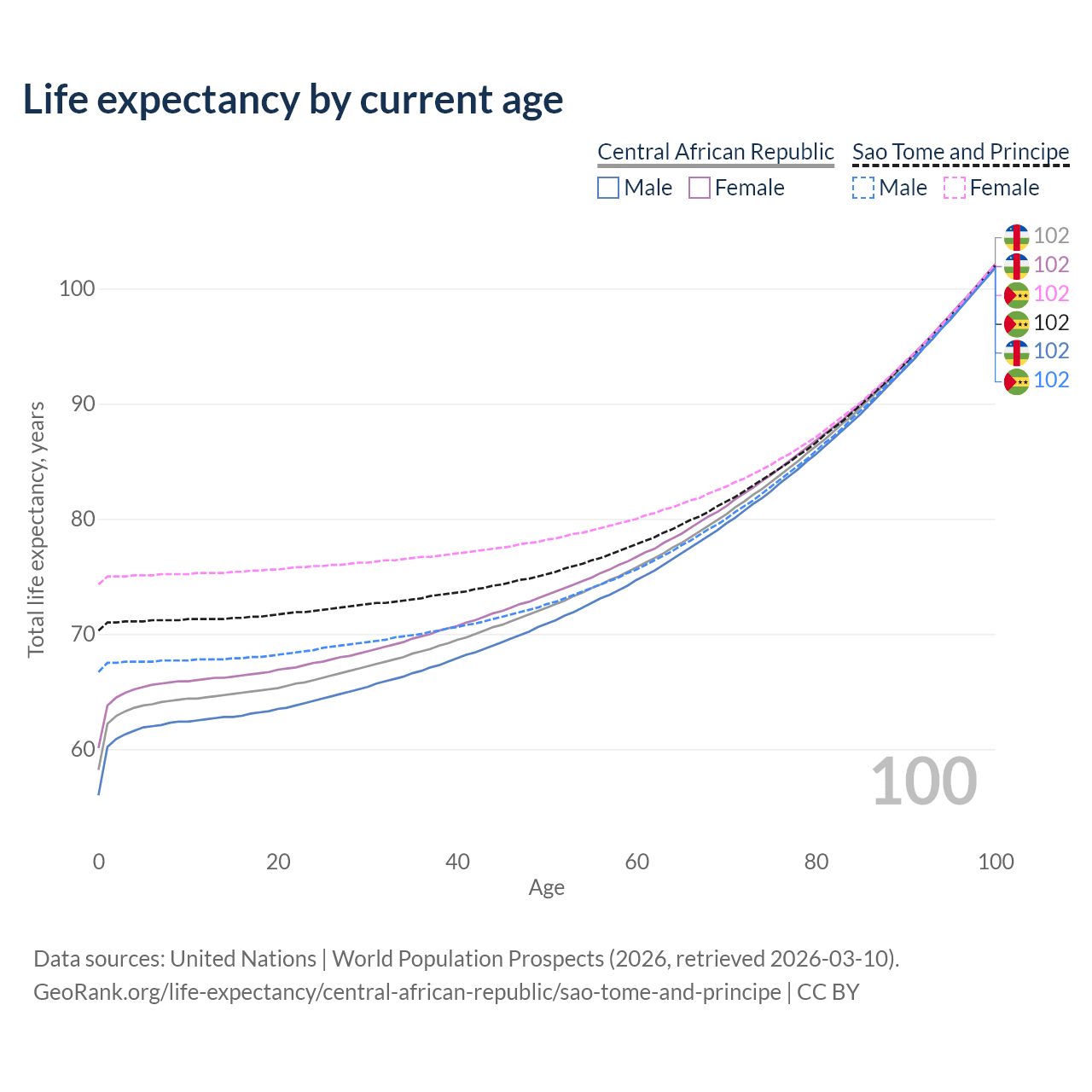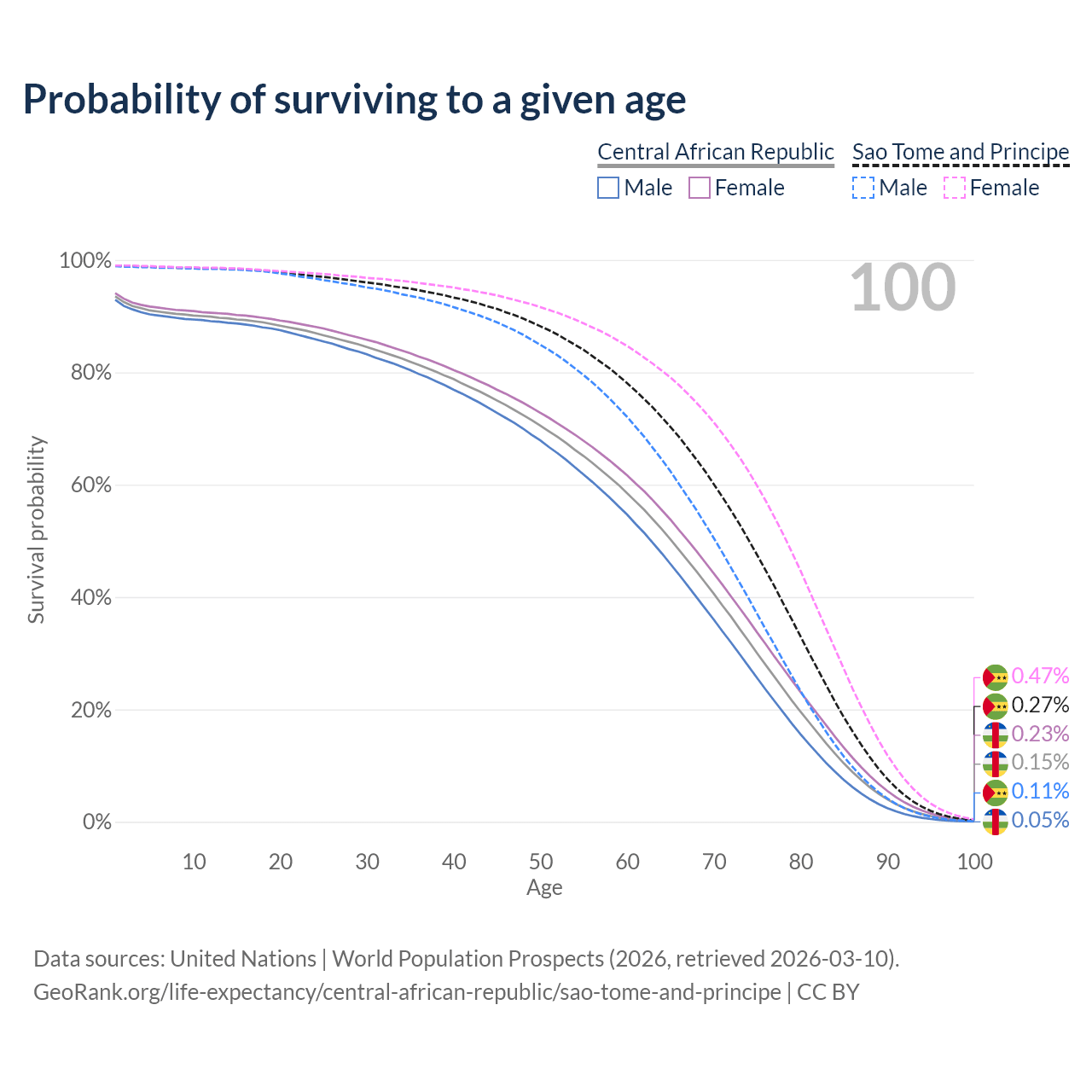 This life expectancy calculator shows the odds of living to 100, 95, 90, and below based on current age for both males and females in the Central African Republic and Sao Tome and Principe, along with mean and median age of death. The calculations are based on the 2026 life tables (actuarial tables) from the UN World Population Prospects.