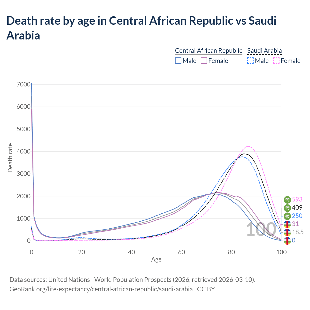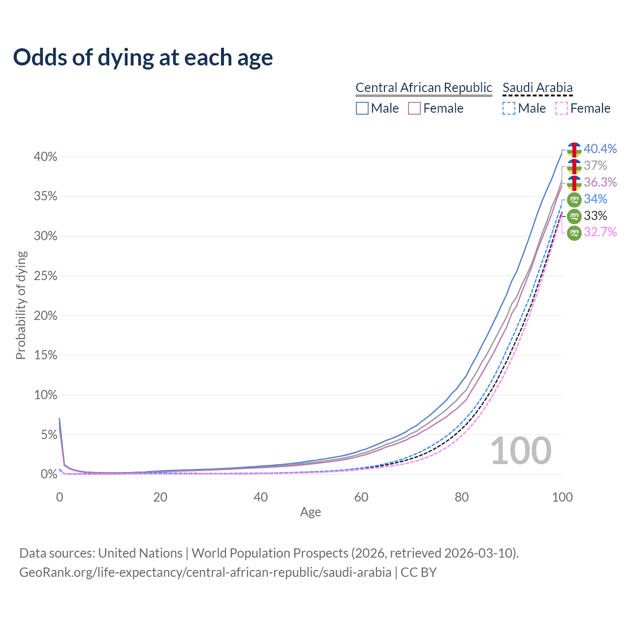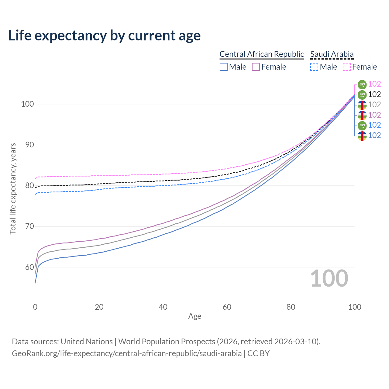 This life expectancy calculator shows the odds of living to 100, 95, 90, and below based on current age for both males and females in the Central African Republic and Saudi Arabia, along with mean and median age of death. The calculations are based on the 2026 life tables (actuarial tables) from the UN World Population Prospects.