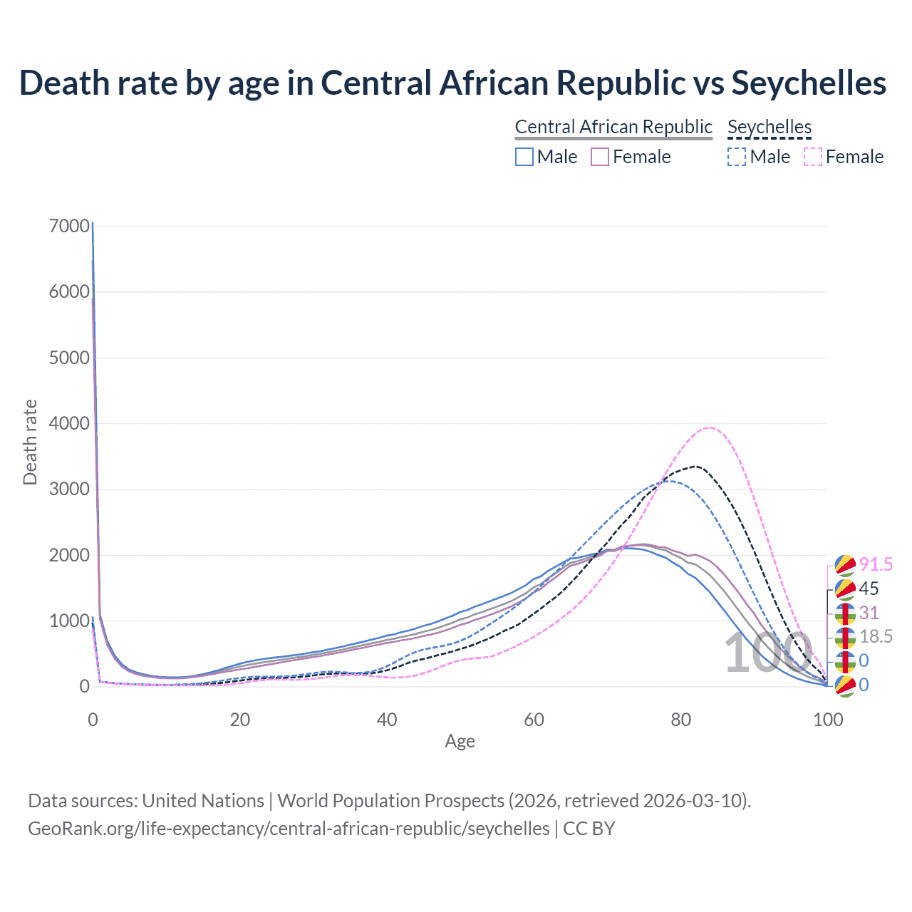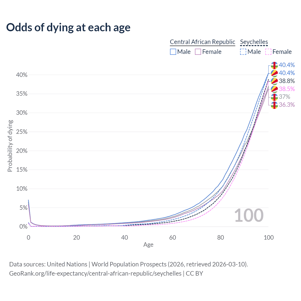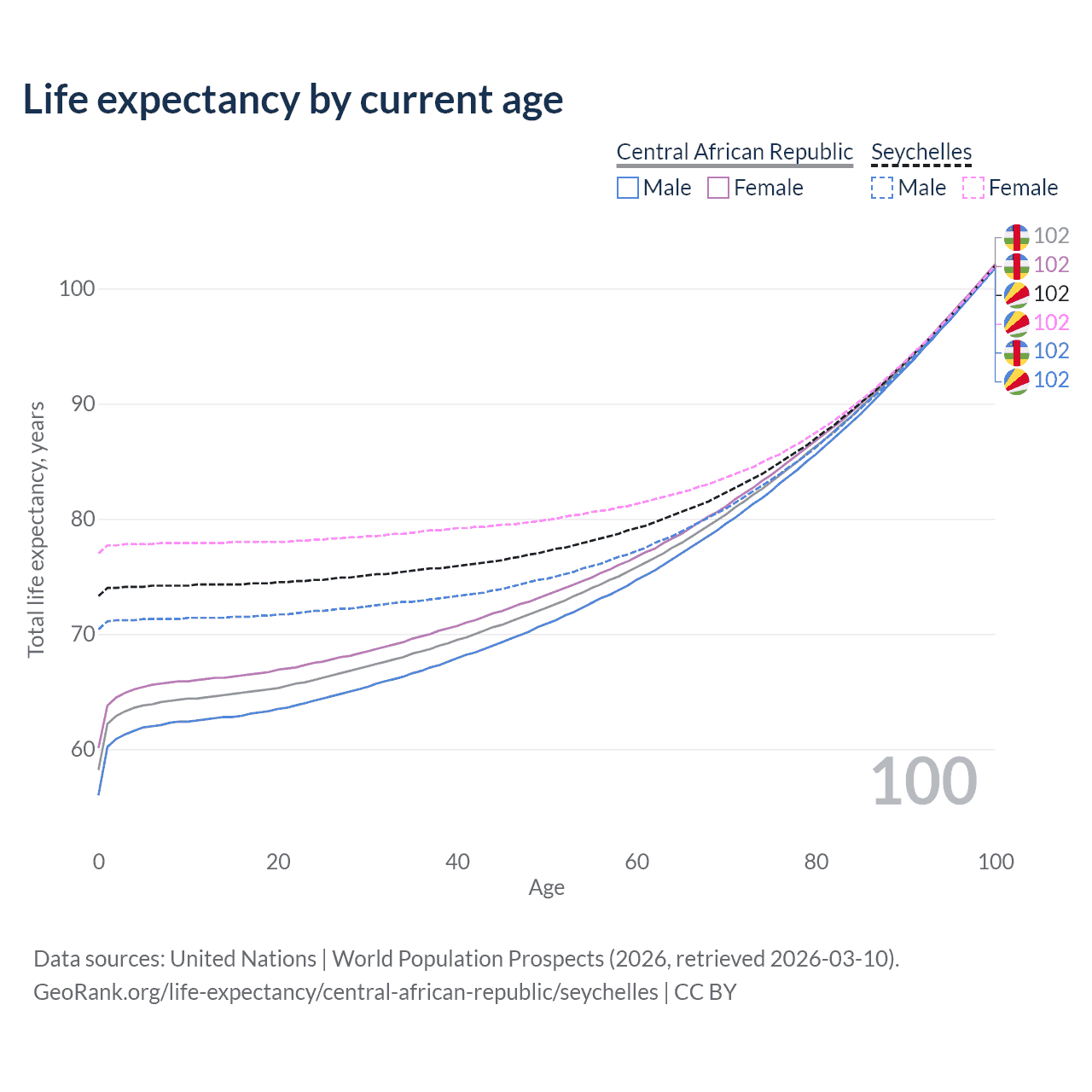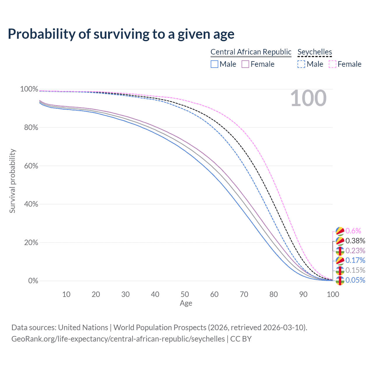 This life expectancy calculator shows the odds of living to 100, 95, 90, and below based on current age for both males and females in the Central African Republic and the Seychelles, along with mean and median age of death. The calculations are based on the 2026 life tables (actuarial tables) from the UN World Population Prospects.