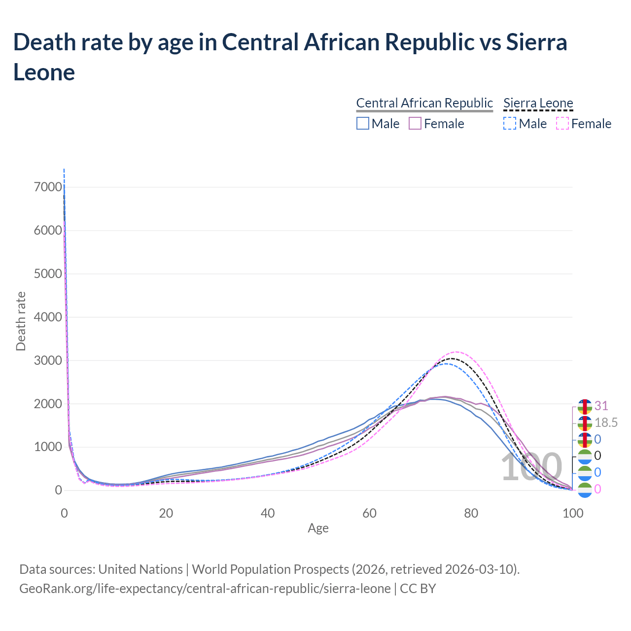 In the Central African Republic, the most common age of death is 0, compared to 0 in Sierra Leone. The median age of death is 65.2 in the Central African Republic and 70.8 in Sierra Leone, meaning only half of each cohort is expected to live past that age.