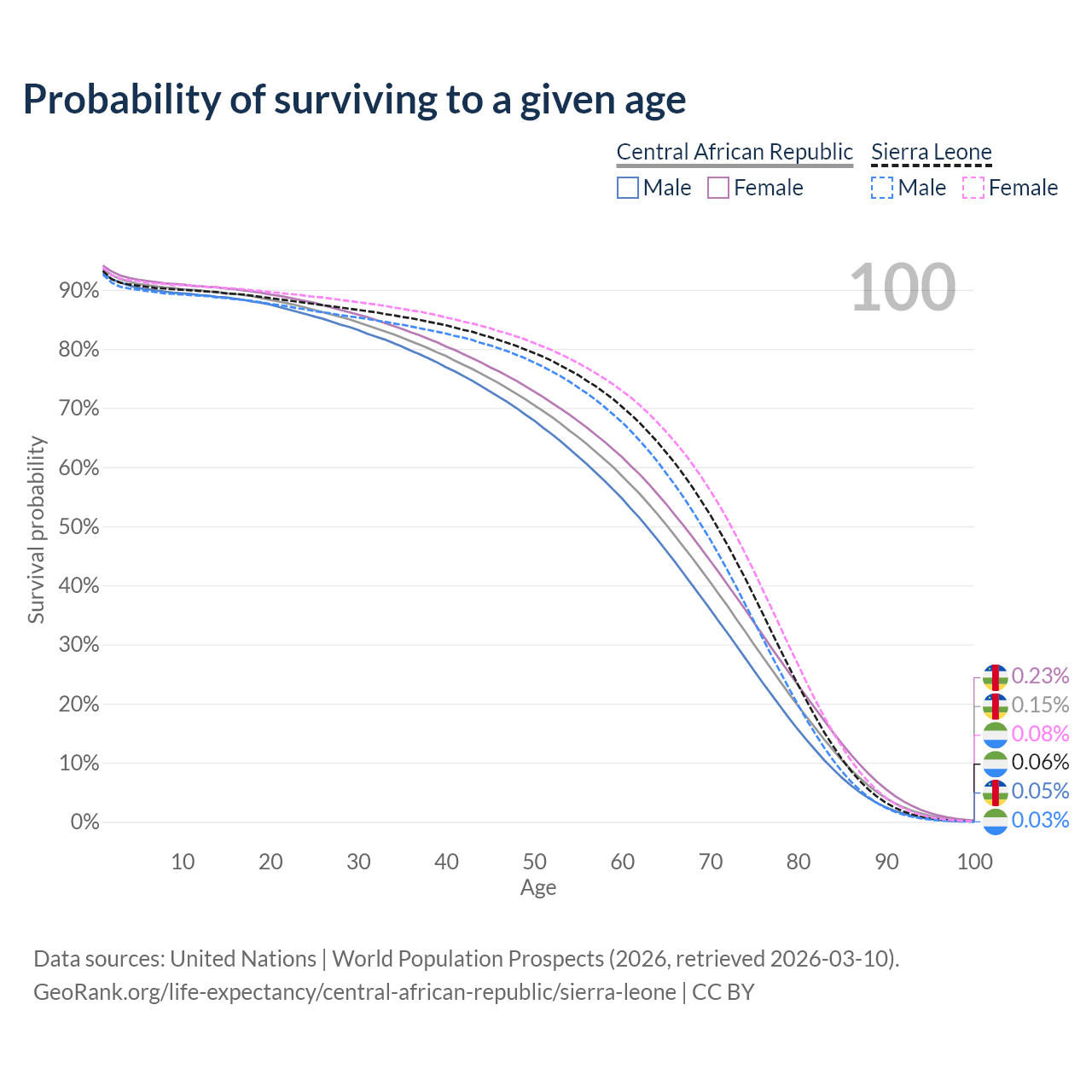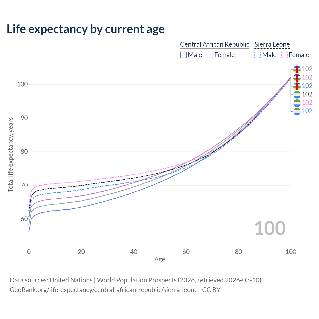 This life expectancy calculator shows the odds of living to 100, 95, 90, and below based on current age for both males and females in the Central African Republic and Sierra Leone, along with mean and median age of death. The calculations are based on the 2026 life tables (actuarial tables) from the UN World Population Prospects.