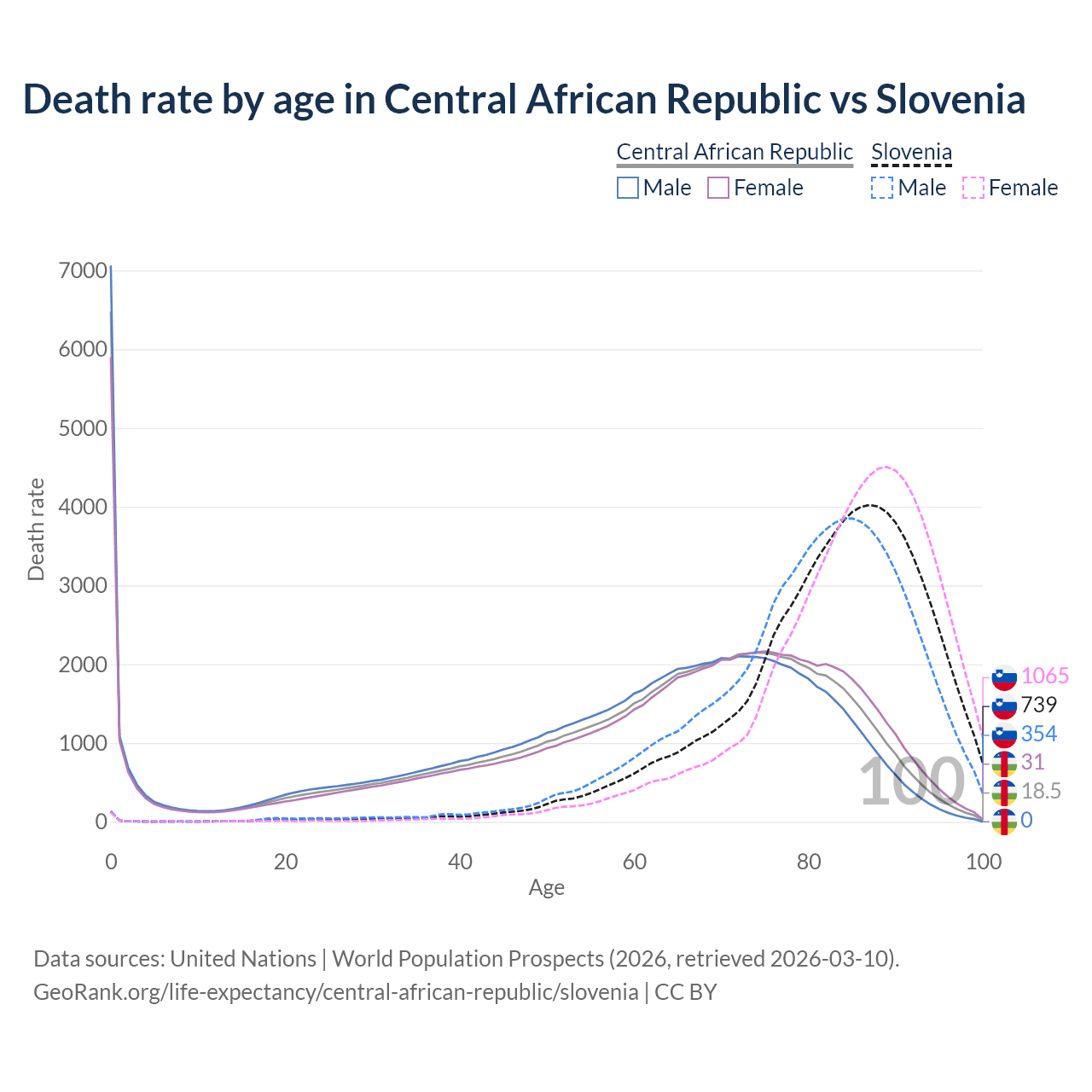In the Central African Republic, the most common age of death is 0, compared to 87 in Slovenia. The median age of death is 65.2 in the Central African Republic and 84.4 in Slovenia, meaning only half of each cohort is expected to live past that age.