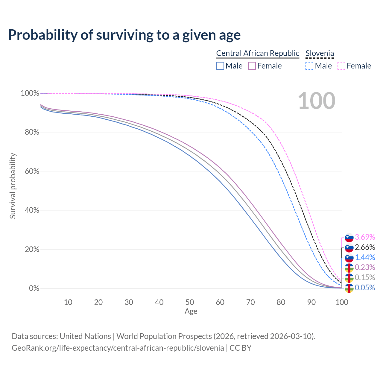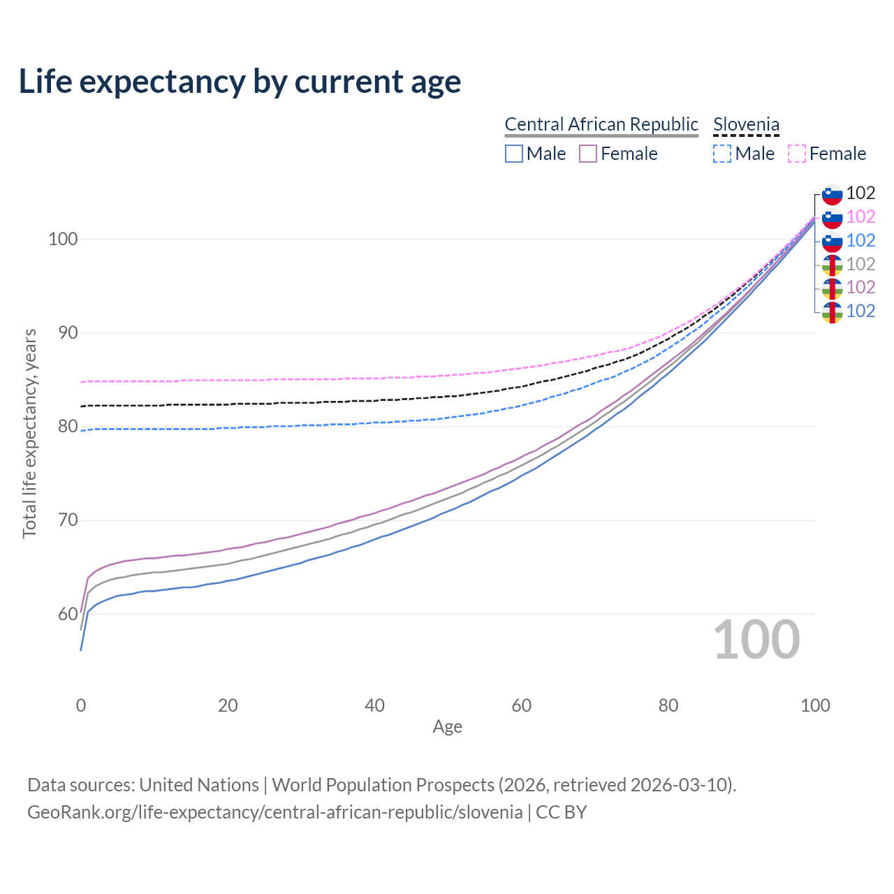 This life expectancy calculator shows the odds of living to 100, 95, 90, and below based on current age for both males and females in the Central African Republic and Slovenia, along with mean and median age of death. The calculations are based on the 2026 life tables (actuarial tables) from the UN World Population Prospects.