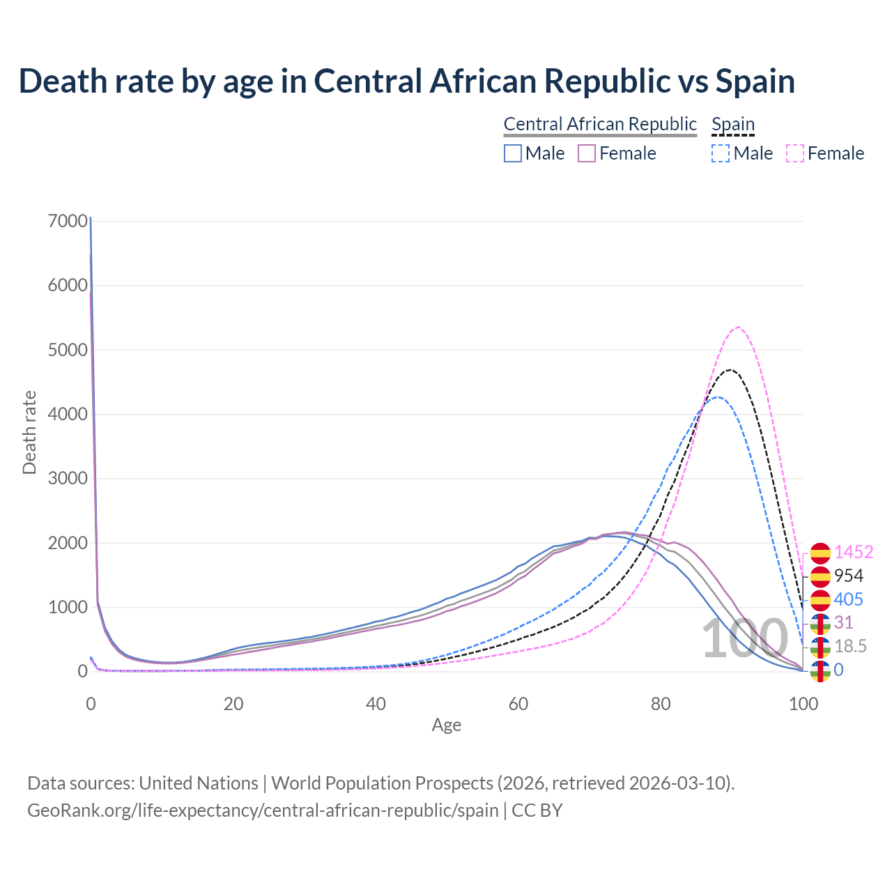 In the Central African Republic, the most common age of death is 0, compared to 90 in Spain. The median age of death is 65.2 in the Central African Republic and 87 in Spain, meaning only half of each cohort is expected to live past that age.