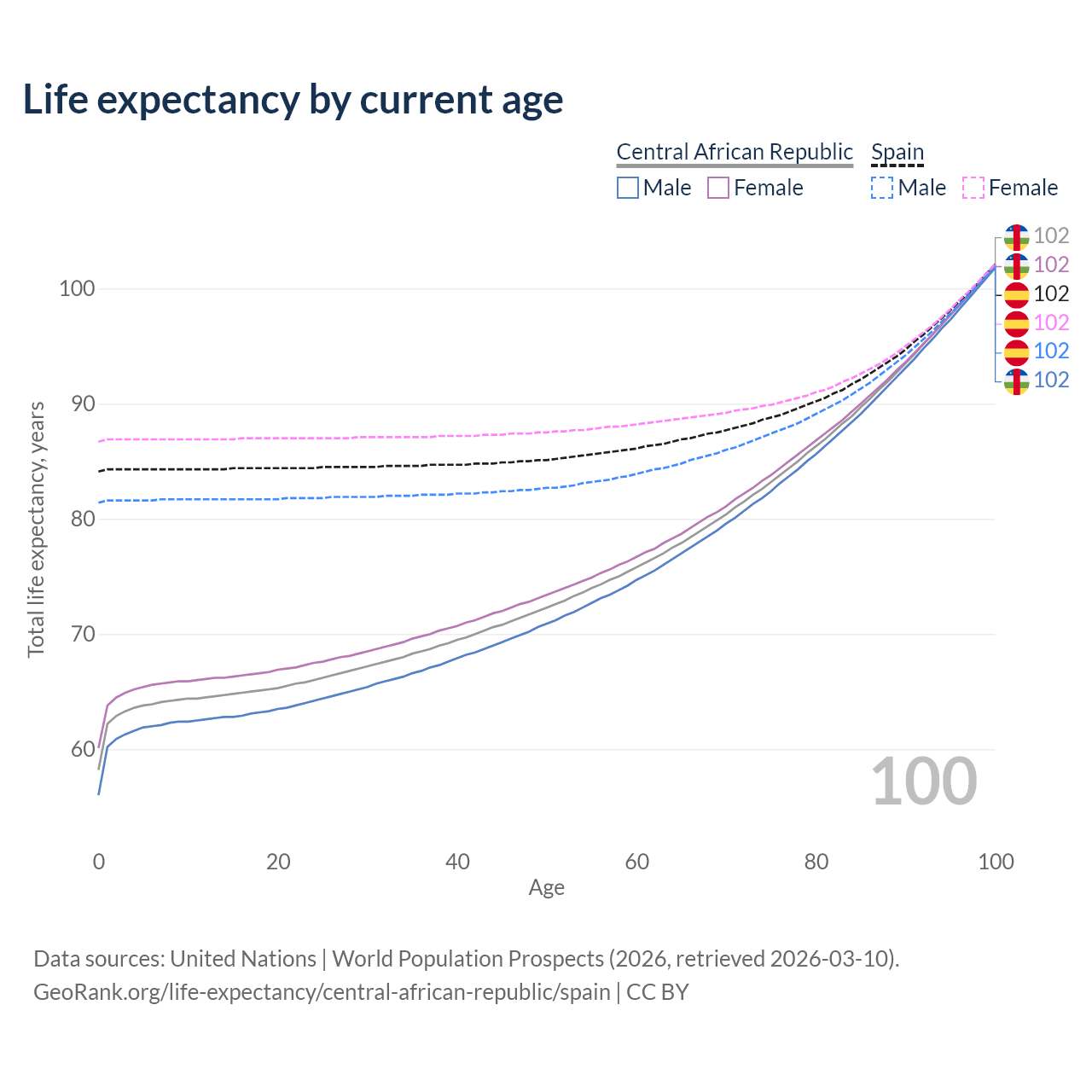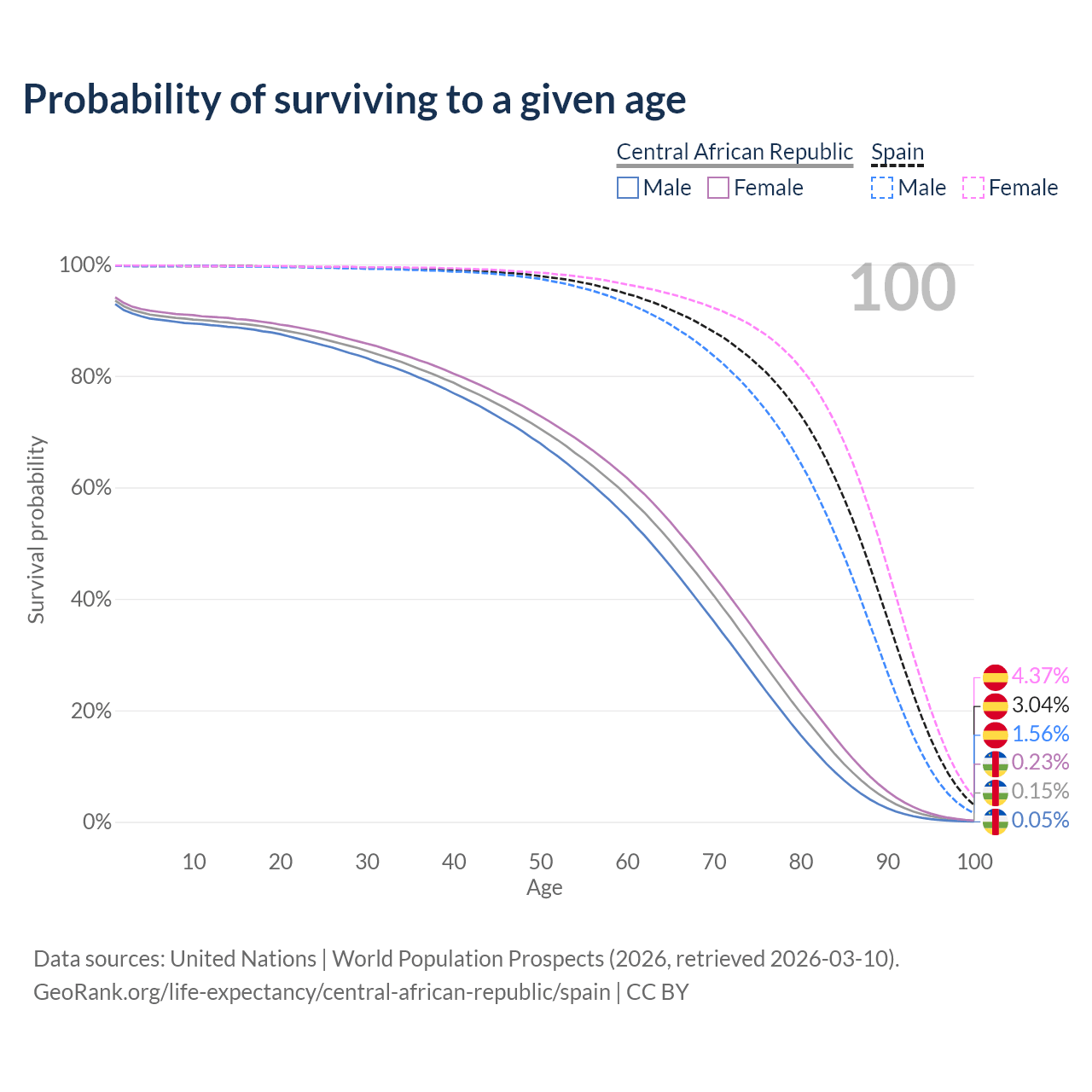 This life expectancy calculator shows the odds of living to 100, 95, 90, and below based on current age for both males and females in the Central African Republic and Spain, along with mean and median age of death. The calculations are based on the 2026 life tables (actuarial tables) from the UN World Population Prospects.
