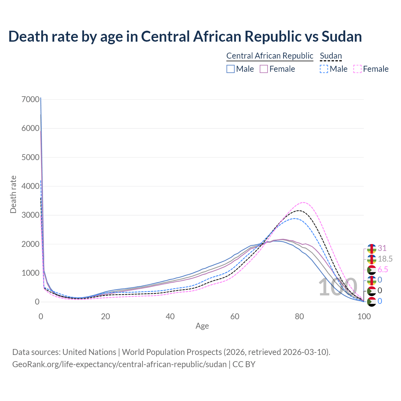 The average life expectancy at birth is 58.2 years in the Central African Republic vs 66.9 in Sudan. The Central African Republic is ranked 194/197 by life expectancy, and Sudan is 160/197. In the Central African Republic, the life expectancy is 56 years for males and 60.1 years for females. In Sudan, it's 63.8 years for males and 70.2 years for females.