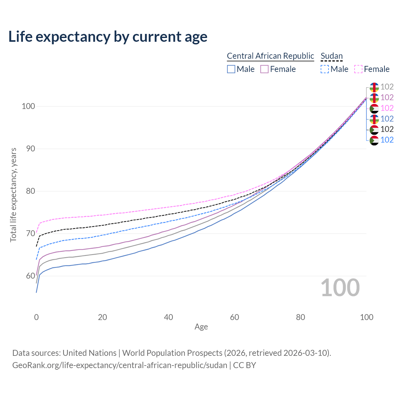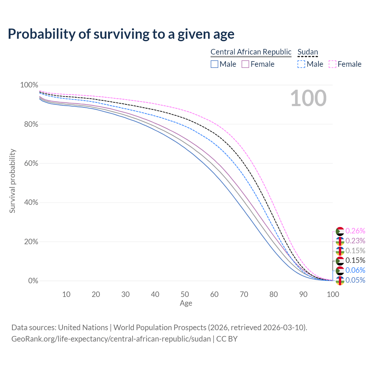 This life expectancy calculator shows the odds of living to 100, 95, 90, and below based on current age for both males and females in the Central African Republic and Sudan, along with mean and median age of death. The calculations are based on the 2026 life tables (actuarial tables) from the UN World Population Prospects.