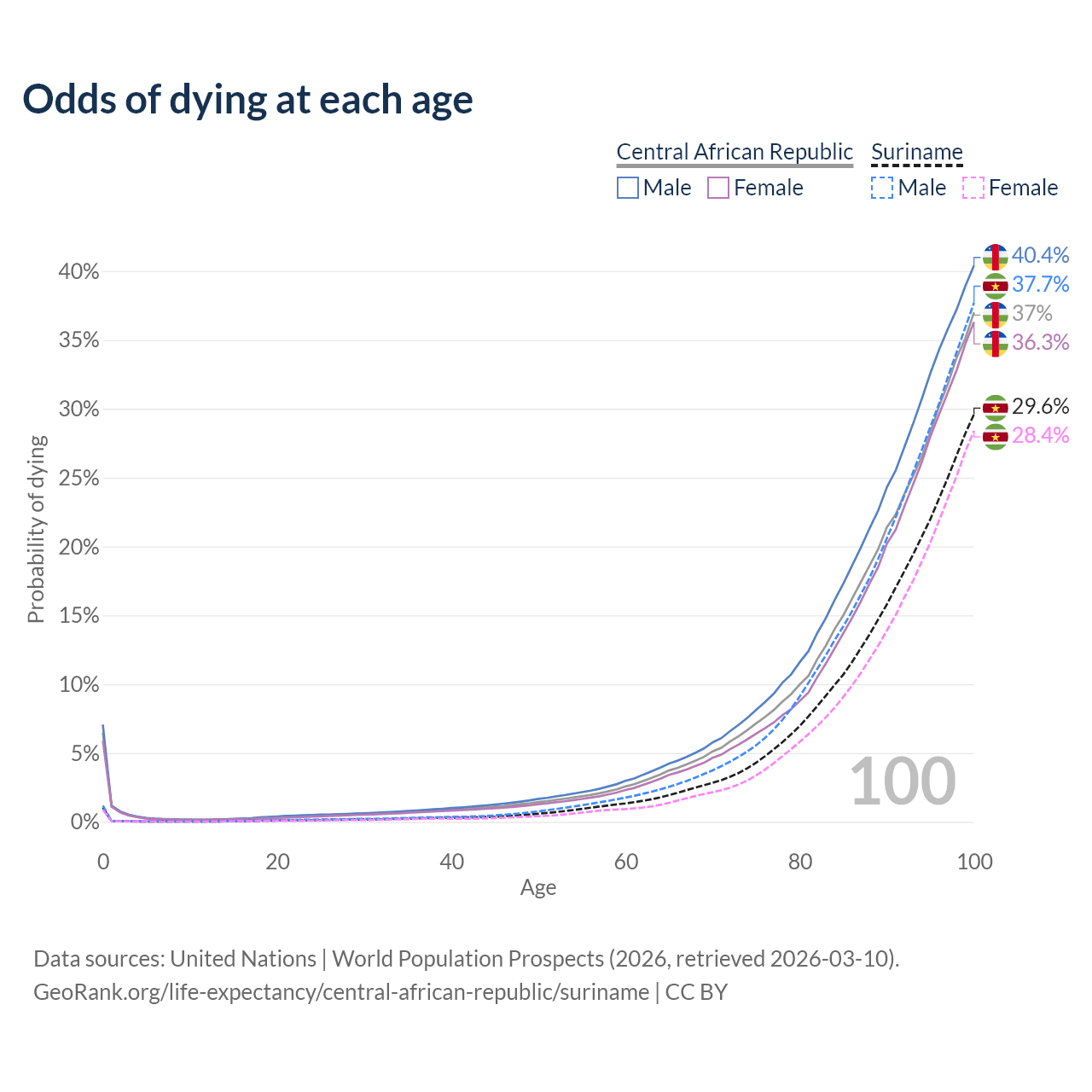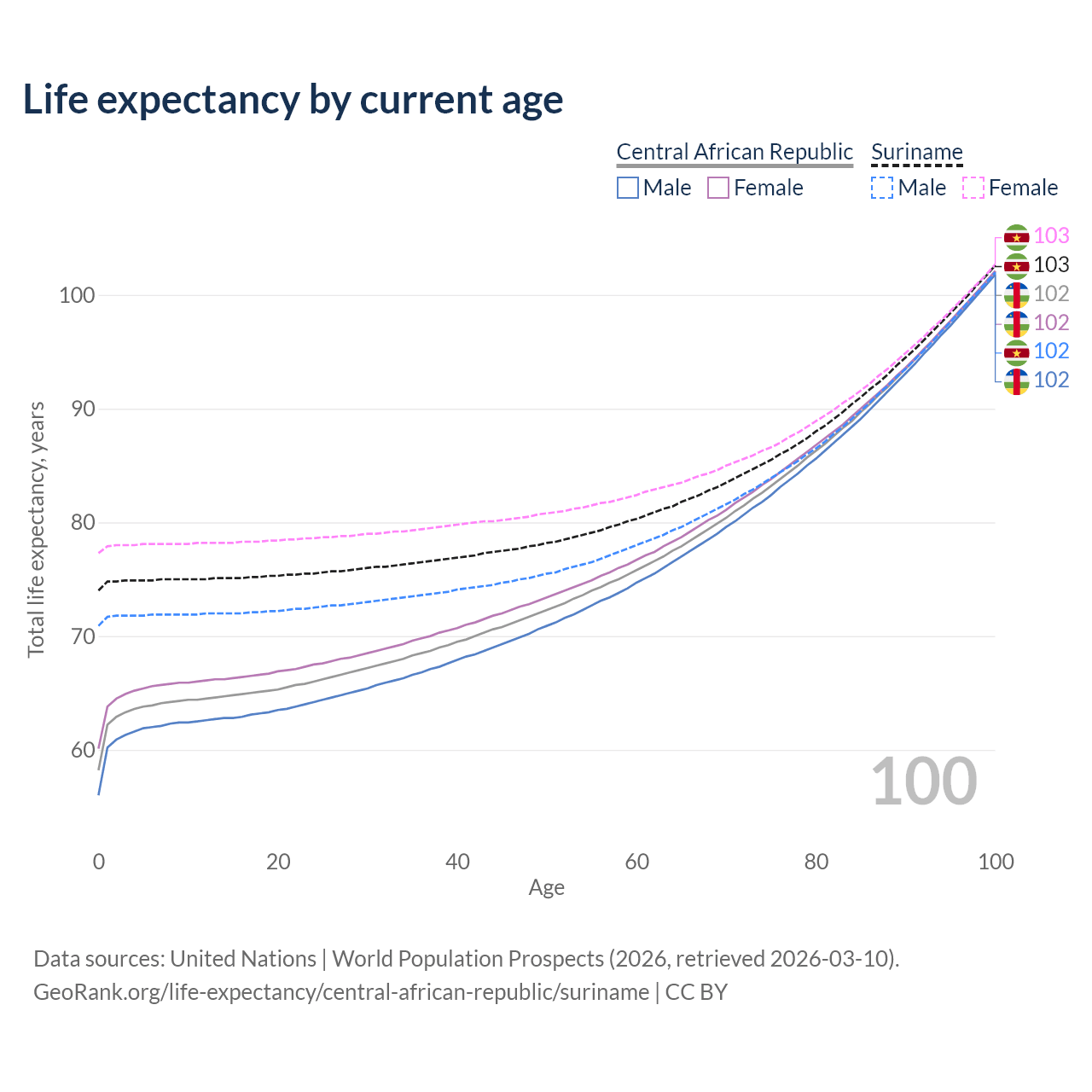 This life expectancy calculator shows the odds of living to 100, 95, 90, and below based on current age for both males and females in the Central African Republic and Suriname, along with mean and median age of death. The calculations are based on the 2026 life tables (actuarial tables) from the UN World Population Prospects.