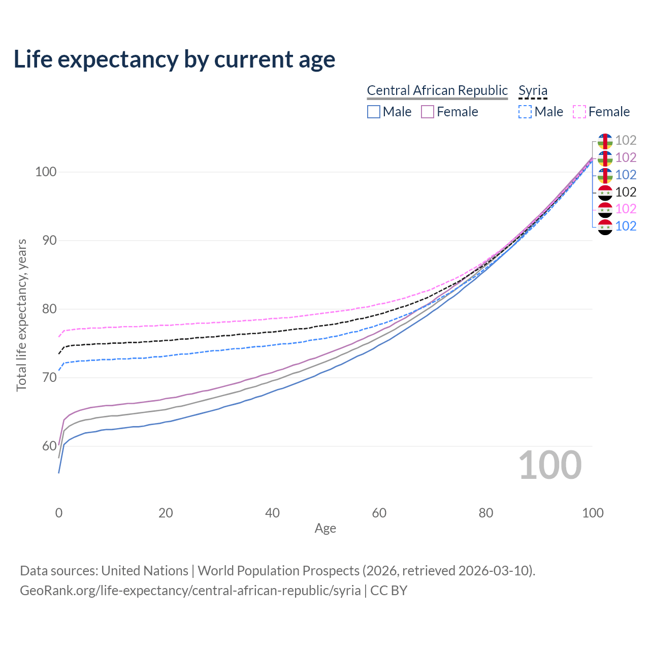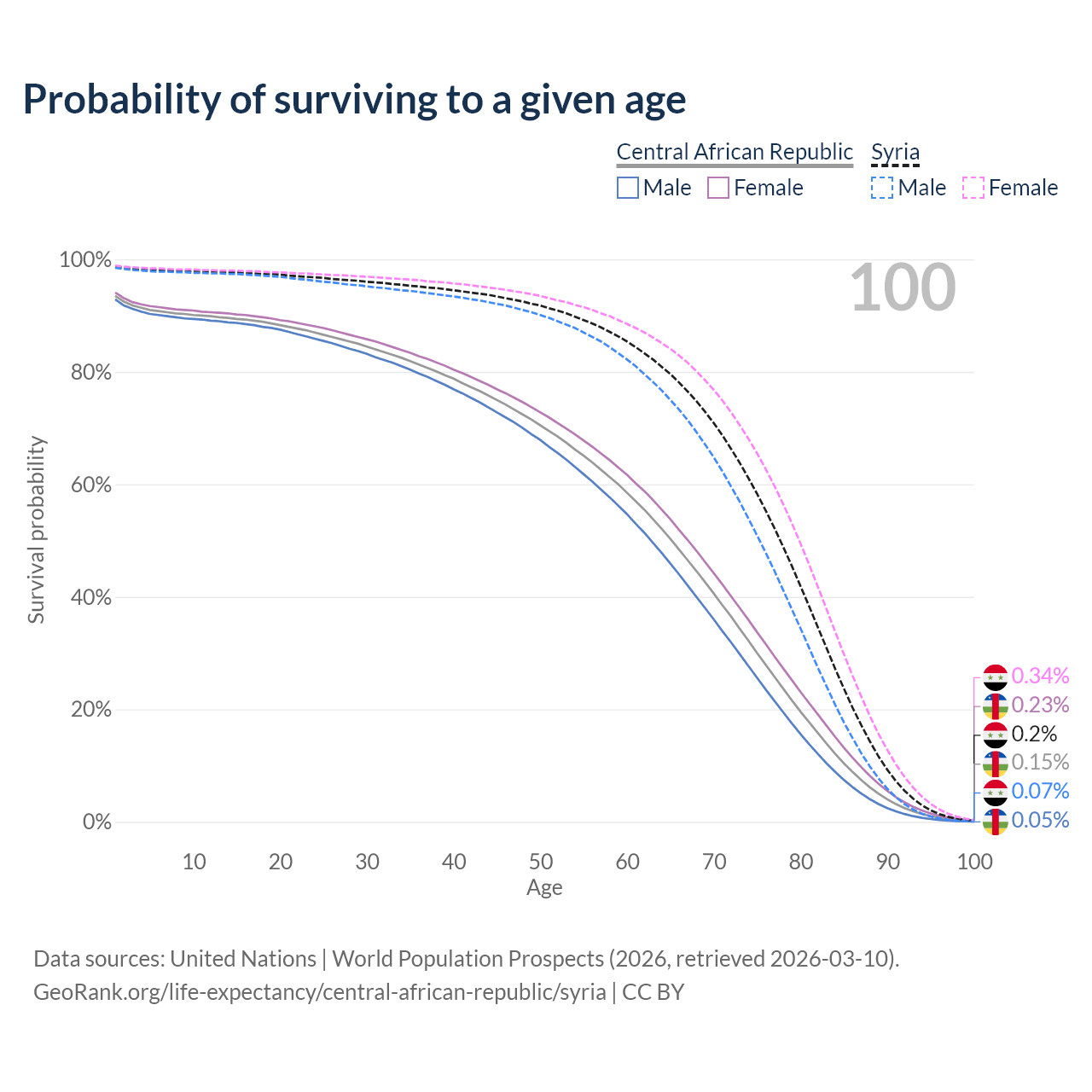 This life expectancy calculator shows the odds of living to 100, 95, 90, and below based on current age for both males and females in the Central African Republic and Syria, along with mean and median age of death. The calculations are based on the 2026 life tables (actuarial tables) from the UN World Population Prospects.