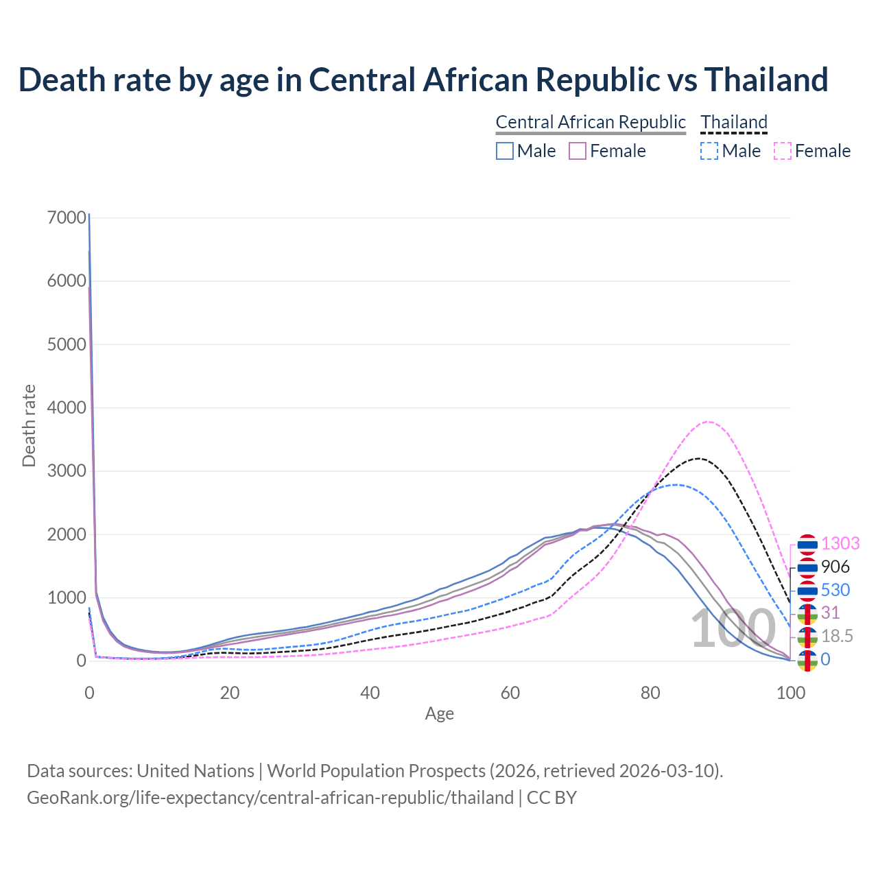 In the Central African Republic, the most common age of death is 0, compared to 87 in Thailand. The median age of death is 65.2 in the Central African Republic and 81.8 in Thailand, meaning only half of each cohort is expected to live past that age.