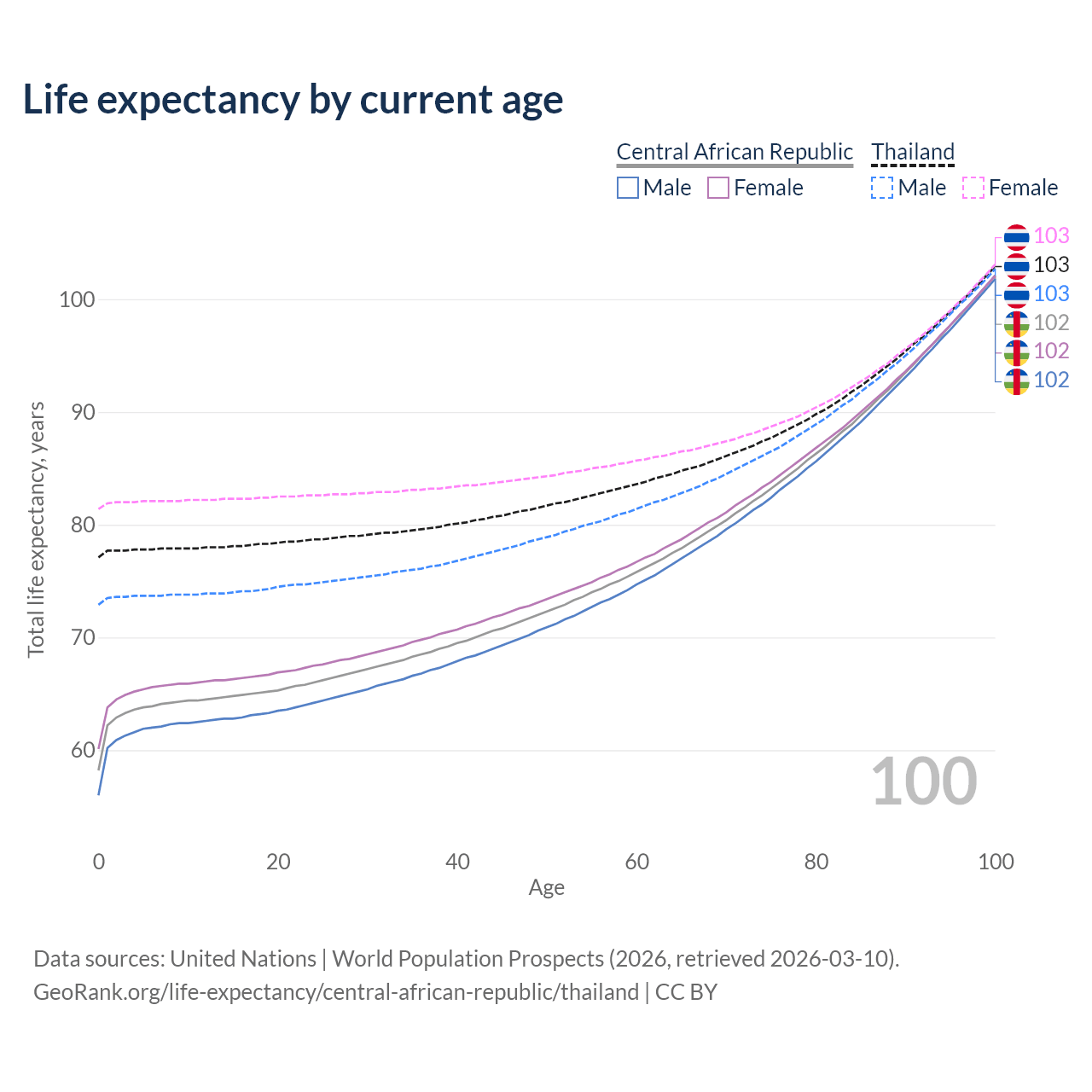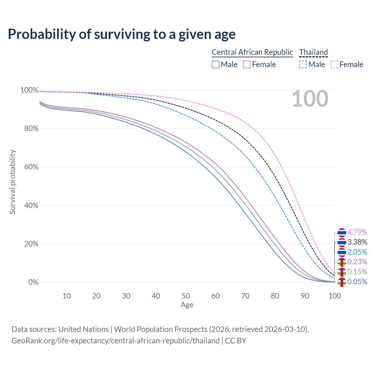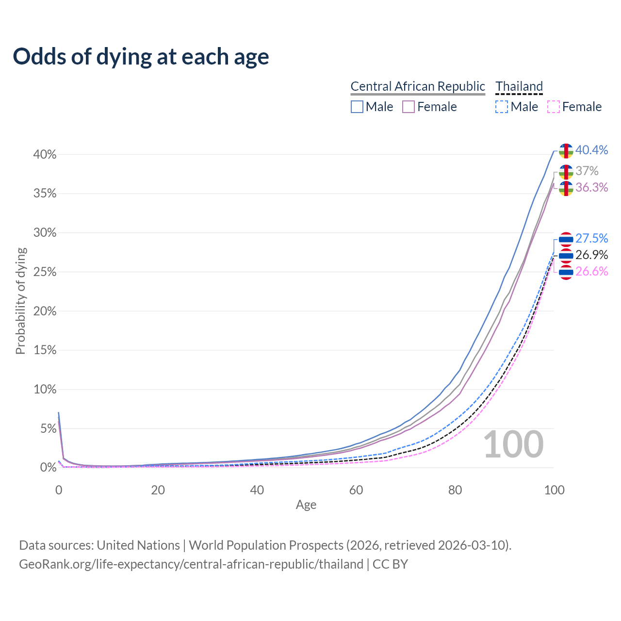 This life expectancy calculator shows the odds of living to 100, 95, 90, and below based on current age for both males and females in the Central African Republic and Thailand, along with mean and median age of death. The calculations are based on the 2026 life tables (actuarial tables) from the UN World Population Prospects.