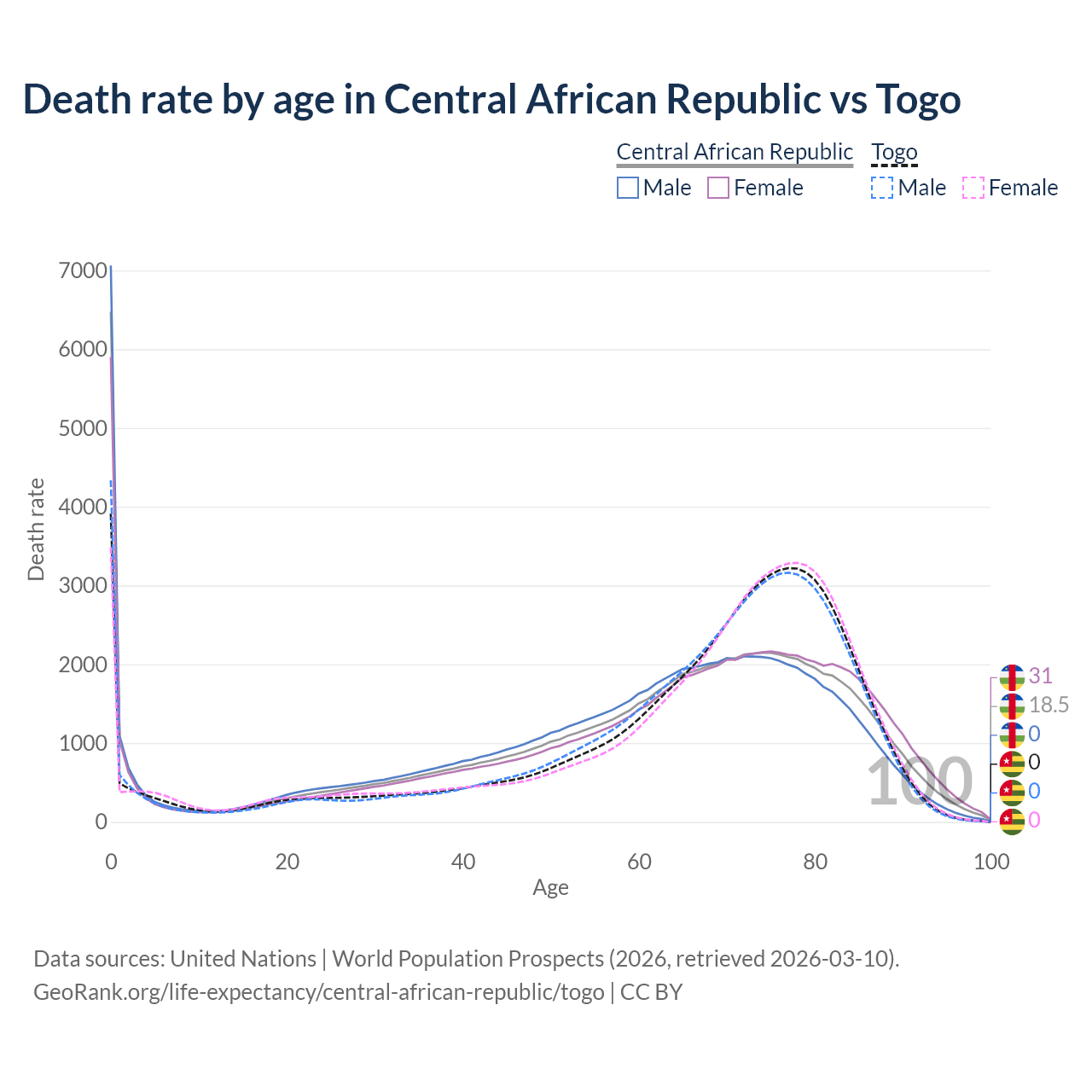 In the Central African Republic, the most common age of death is 0, compared to 0 in Togo. The median age of death is 65.2 in the Central African Republic and 71 in Togo, meaning only half of each cohort is expected to live past that age.