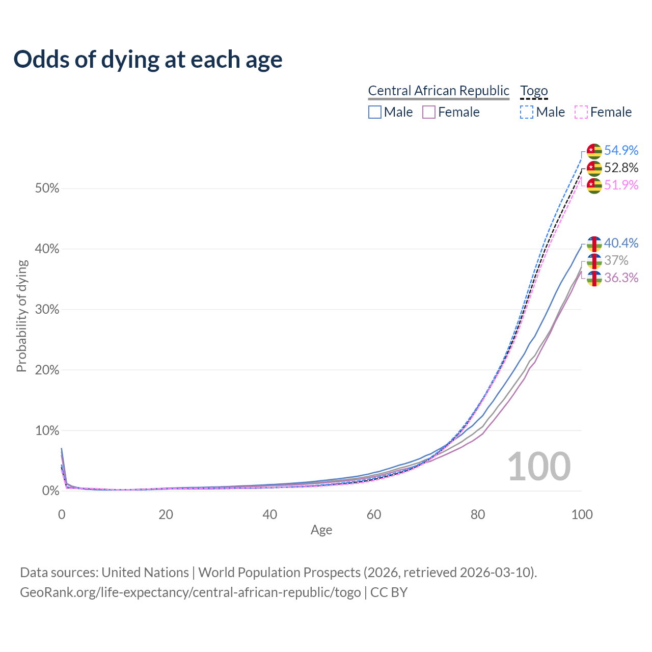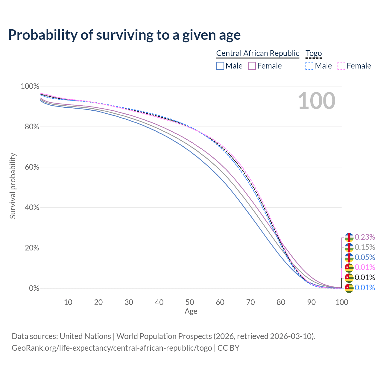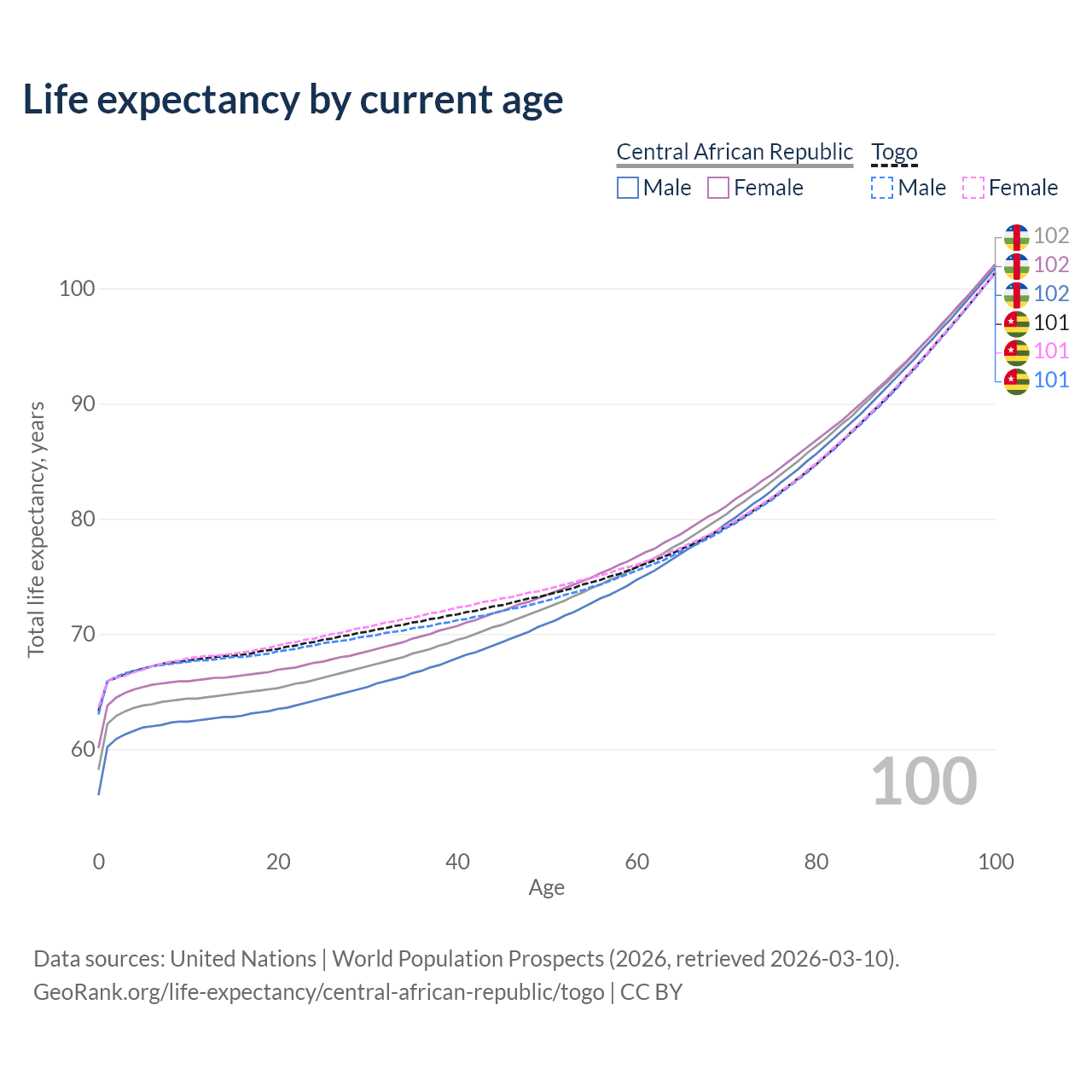 This life expectancy calculator shows the odds of living to 100, 95, 90, and below based on current age for both males and females in the Central African Republic and Togo, along with mean and median age of death. The calculations are based on the 2026 life tables (actuarial tables) from the UN World Population Prospects.