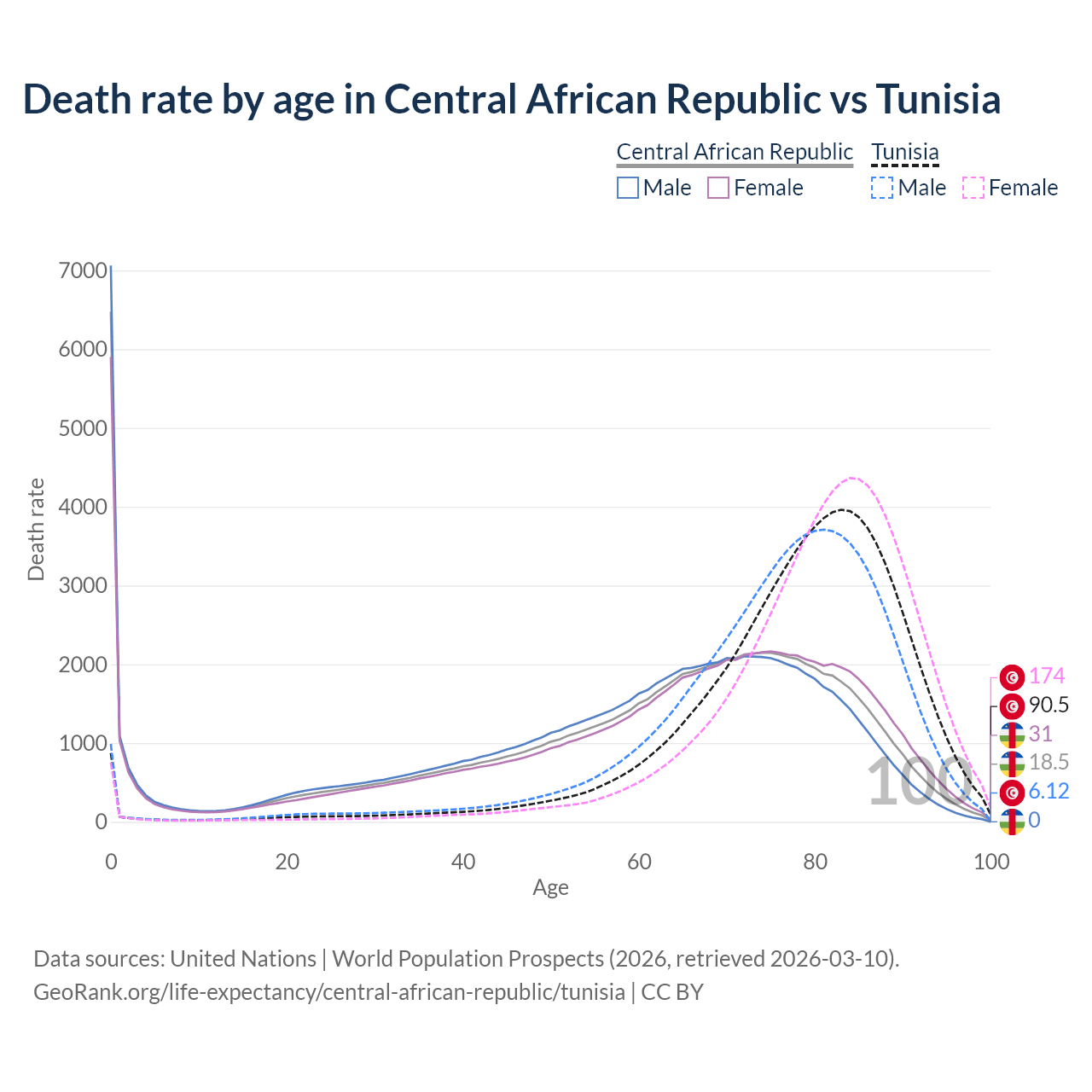 In the Central African Republic, the most common age of death is 0, compared to 83 in Tunisia. The median age of death is 65.2 in the Central African Republic and 80.2 in Tunisia, meaning only half of each cohort is expected to live past that age.