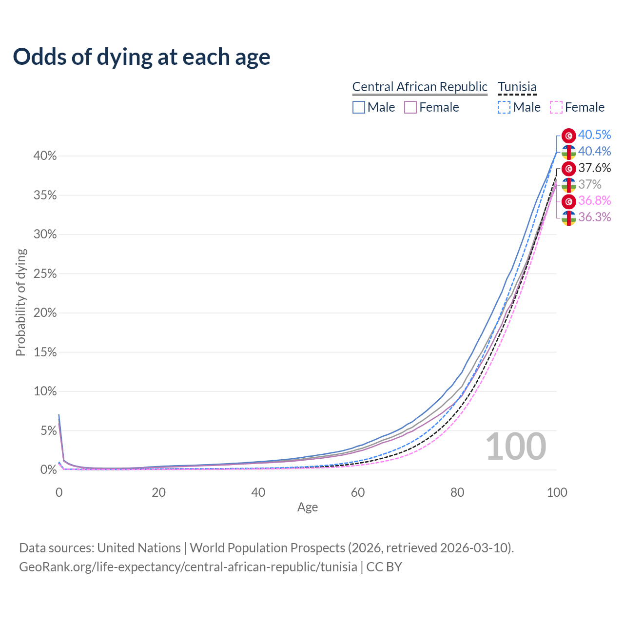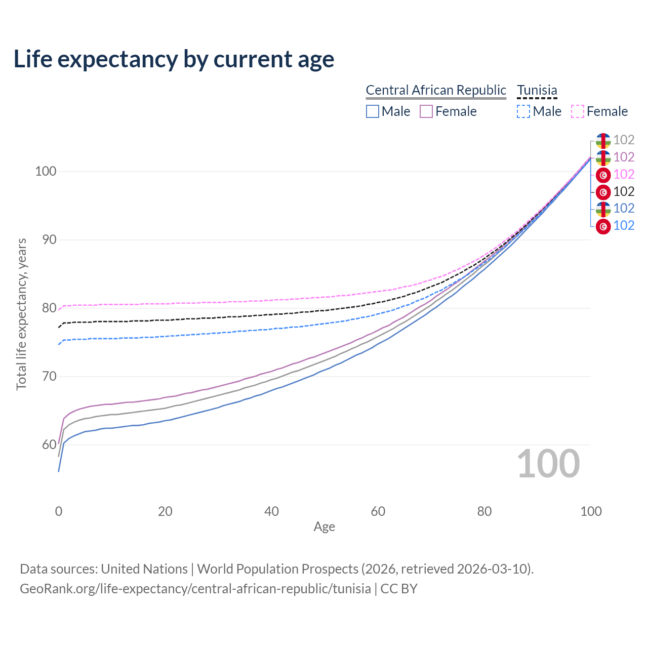 This life expectancy calculator shows the odds of living to 100, 95, 90, and below based on current age for both males and females in the Central African Republic and Tunisia, along with mean and median age of death. The calculations are based on the 2026 life tables (actuarial tables) from the UN World Population Prospects.