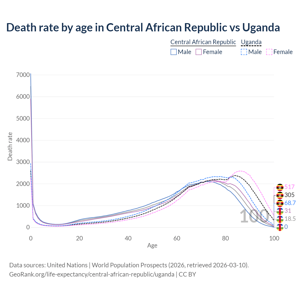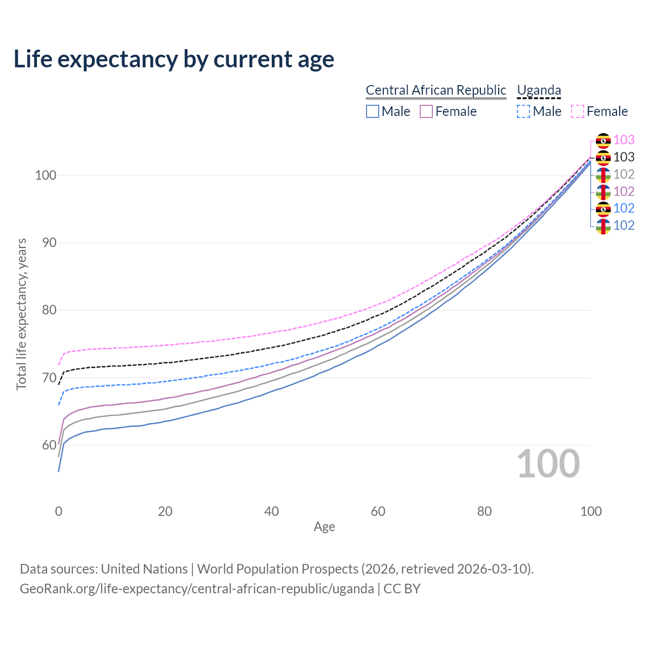 This life expectancy calculator shows the odds of living to 100, 95, 90, and below based on current age for both males and females in the Central African Republic and Uganda, along with mean and median age of death. The calculations are based on the 2026 life tables (actuarial tables) from the UN World Population Prospects.
