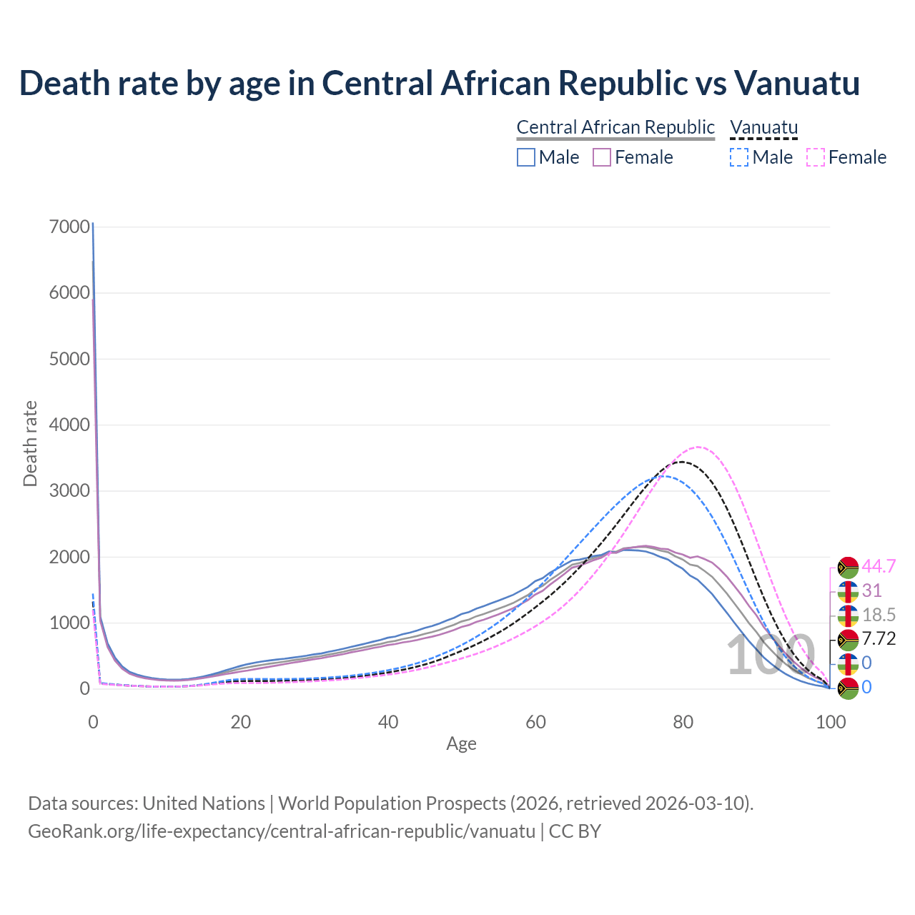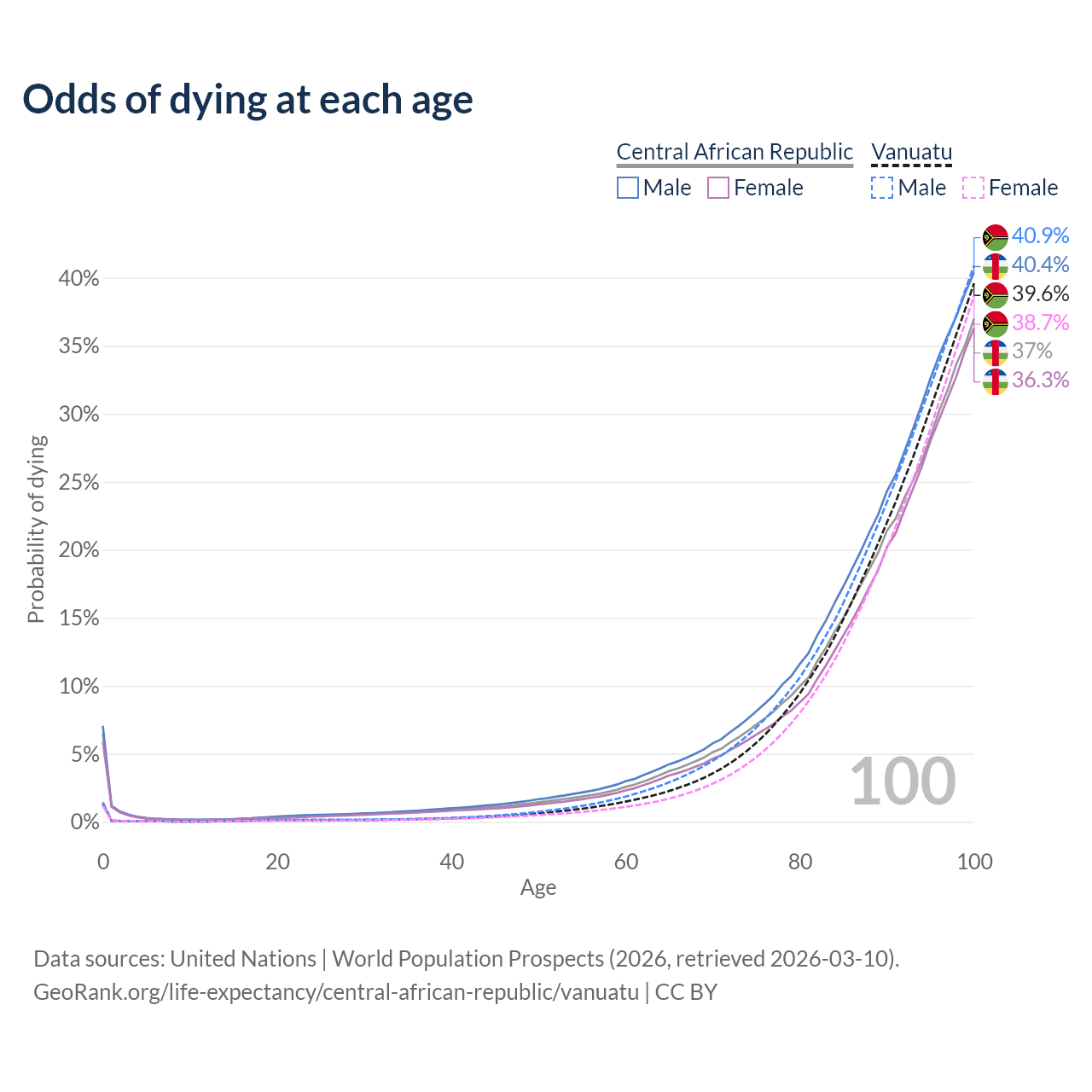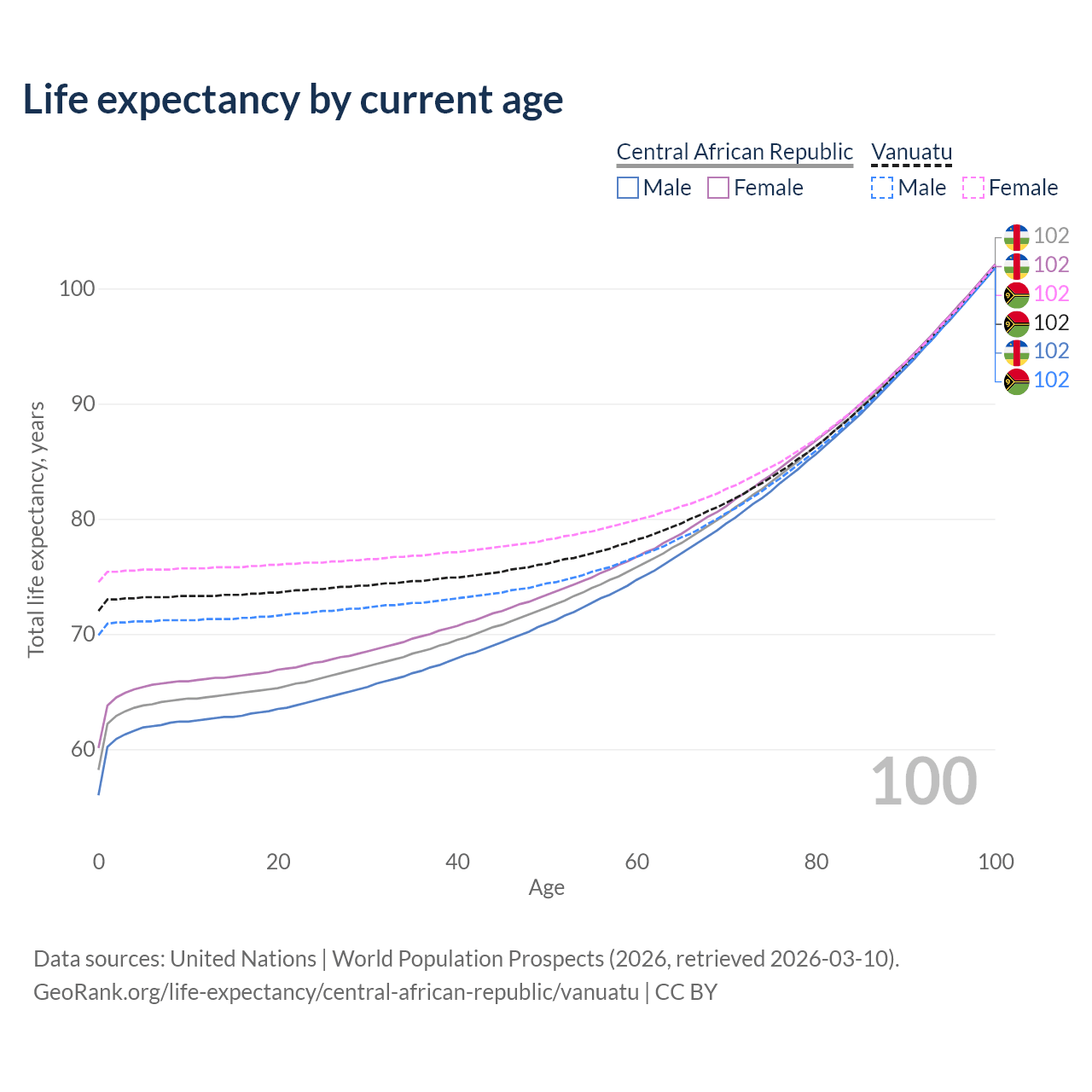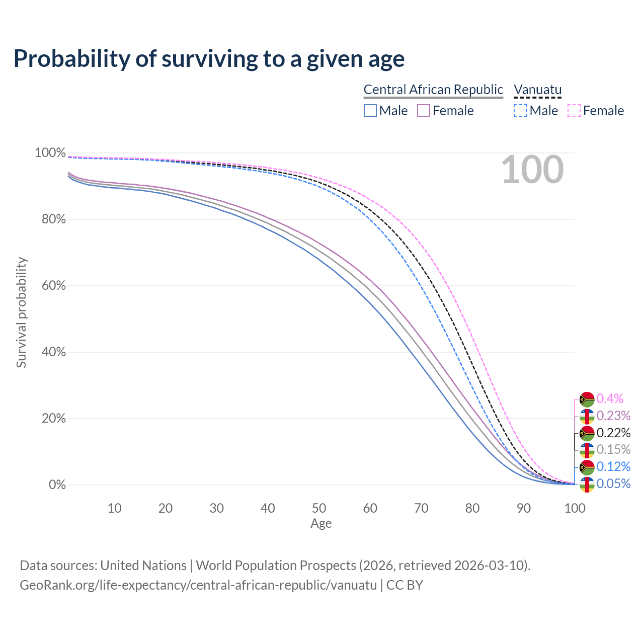 This life expectancy calculator shows the odds of living to 100, 95, 90, and below based on current age for both males and females in the Central African Republic and Vanuatu, along with mean and median age of death. The calculations are based on the 2026 life tables (actuarial tables) from the UN World Population Prospects.