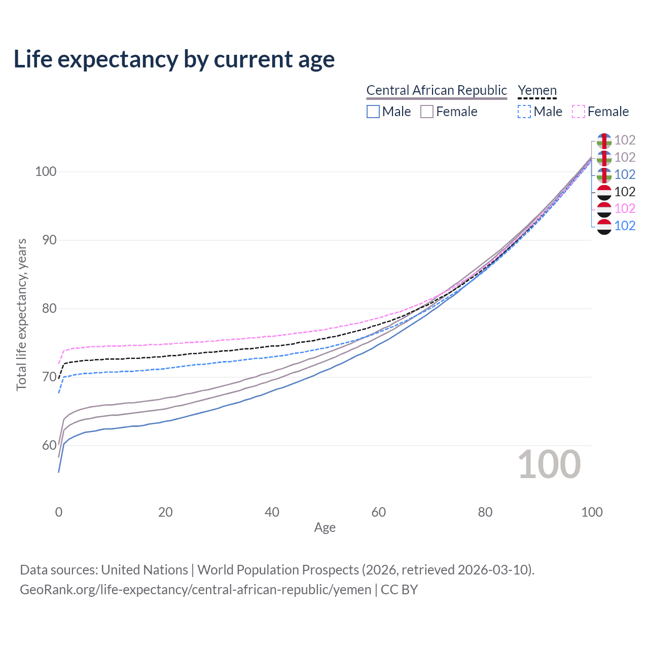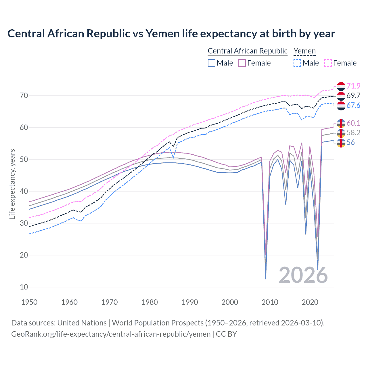 The average life expectancy at birth is 58.2 years in the Central African Republic vs 69.7 in Yemen. The Central African Republic is ranked 194/197 by life expectancy, and Yemen is 138/197. In the Central African Republic, the life expectancy is 56 years for males and 60.1 years for females. In Yemen, it's 67.6 years for males and 71.9 years for females.