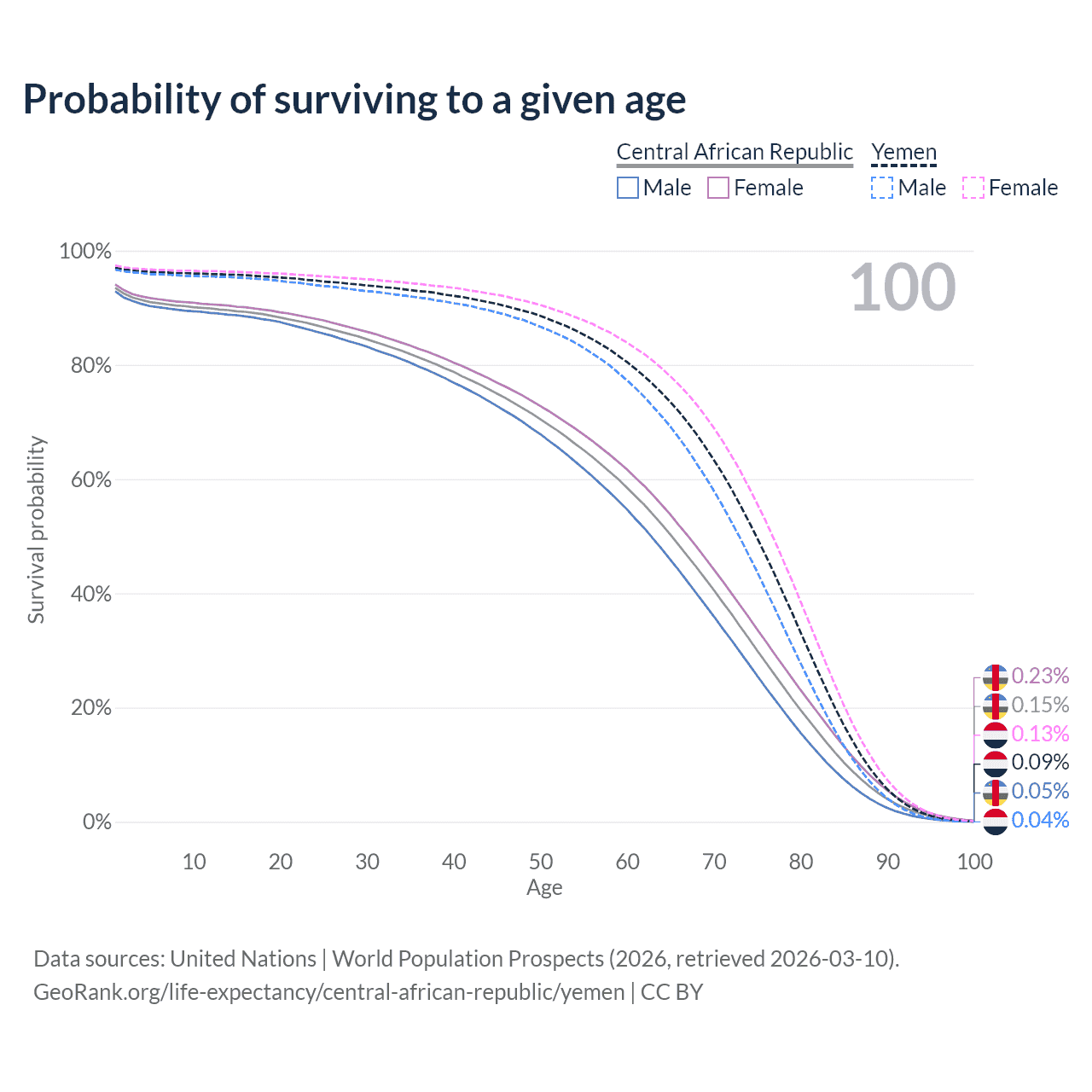 This life expectancy calculator shows the odds of living to 100, 95, 90, and below based on current age for both males and females in the Central African Republic and Yemen, along with mean and median age of death. The calculations are based on the 2026 life tables (actuarial tables) from the UN World Population Prospects.