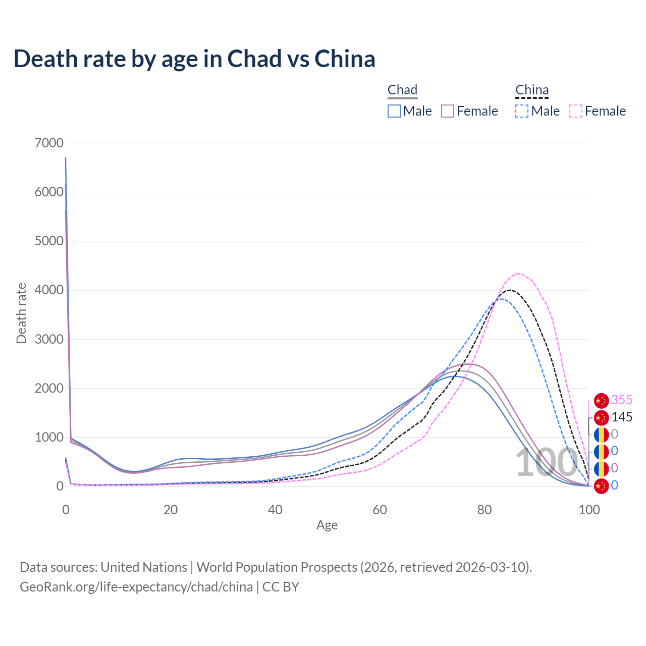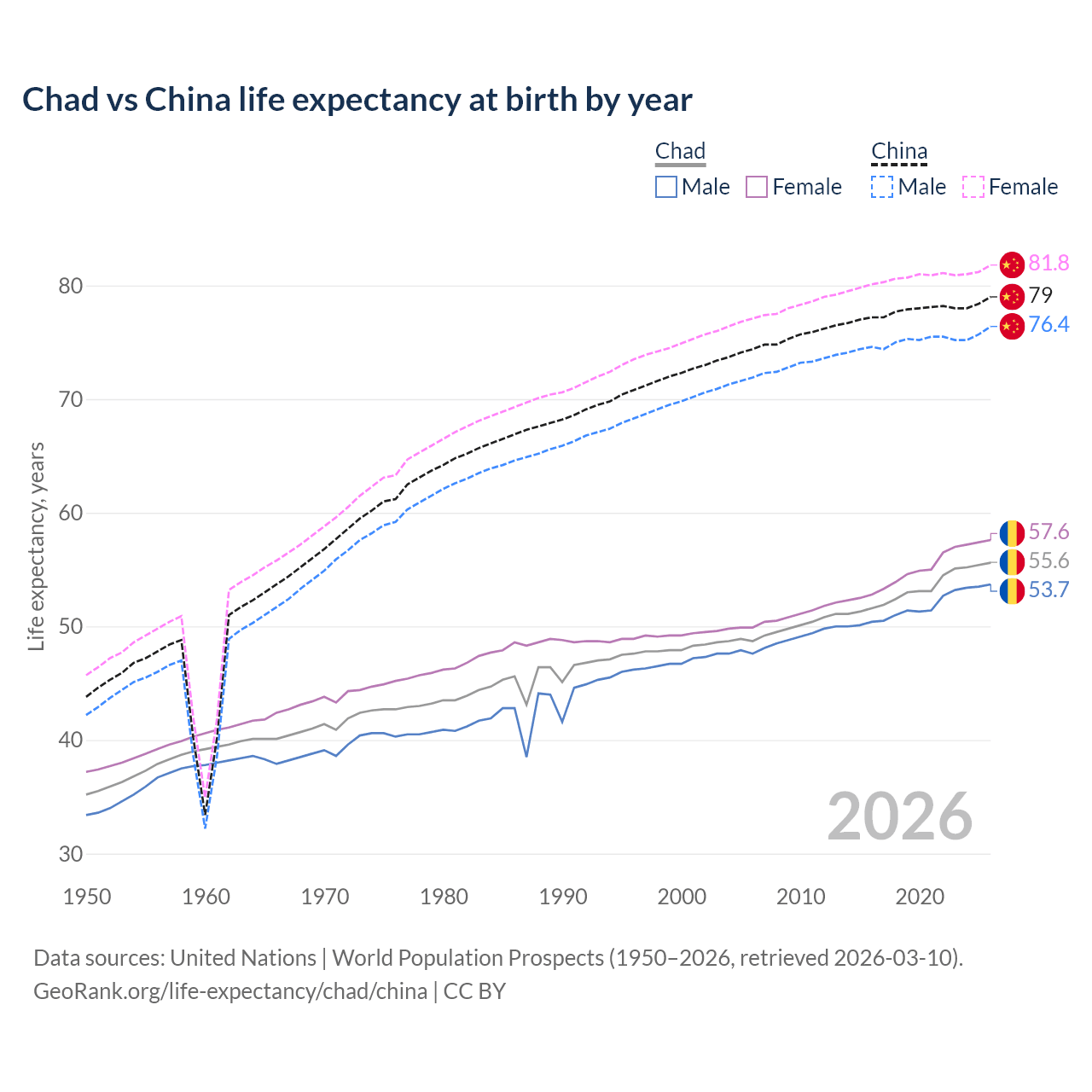 The average life expectancy at birth is 55.6 years in Chad vs 79 in China. Chad is ranked 196/197 by life expectancy, and China is 52/197. In Chad, the life expectancy is 53.7 years for males and 57.6 years for females. In China, it's 76.4 years for males and 81.8 years for females.