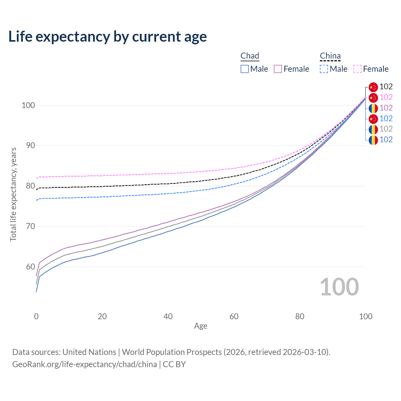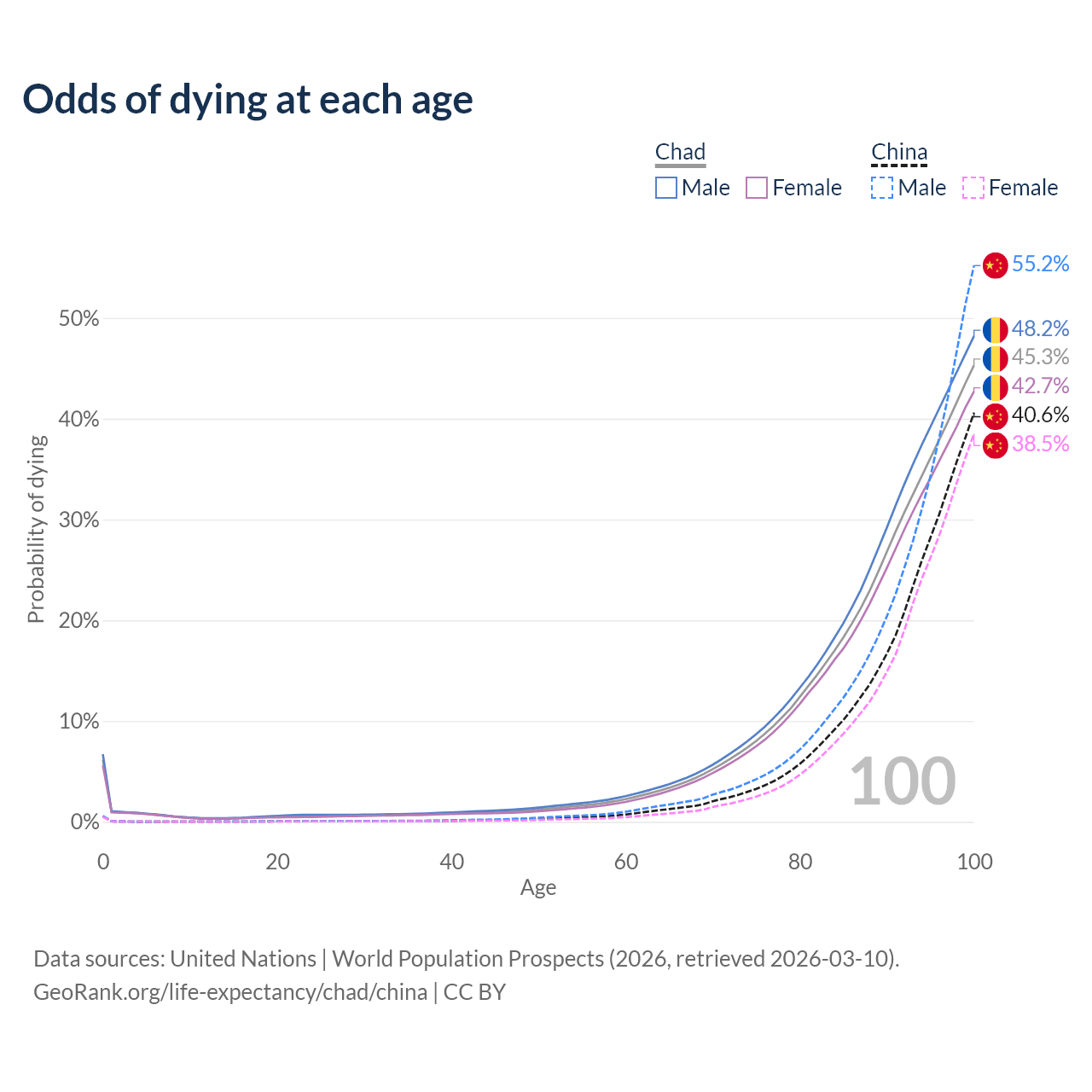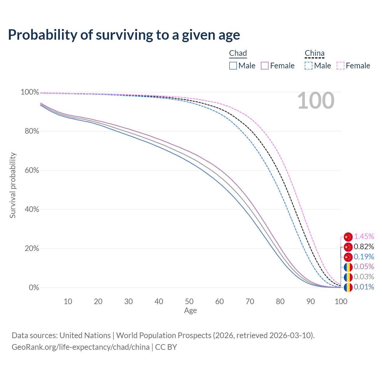 This life expectancy calculator shows the odds of living to 100, 95, 90, and below based on current age for both males and females in Chad and China, along with mean and median age of death. The calculations are based on the 2026 life tables (actuarial tables) from the UN World Population Prospects.