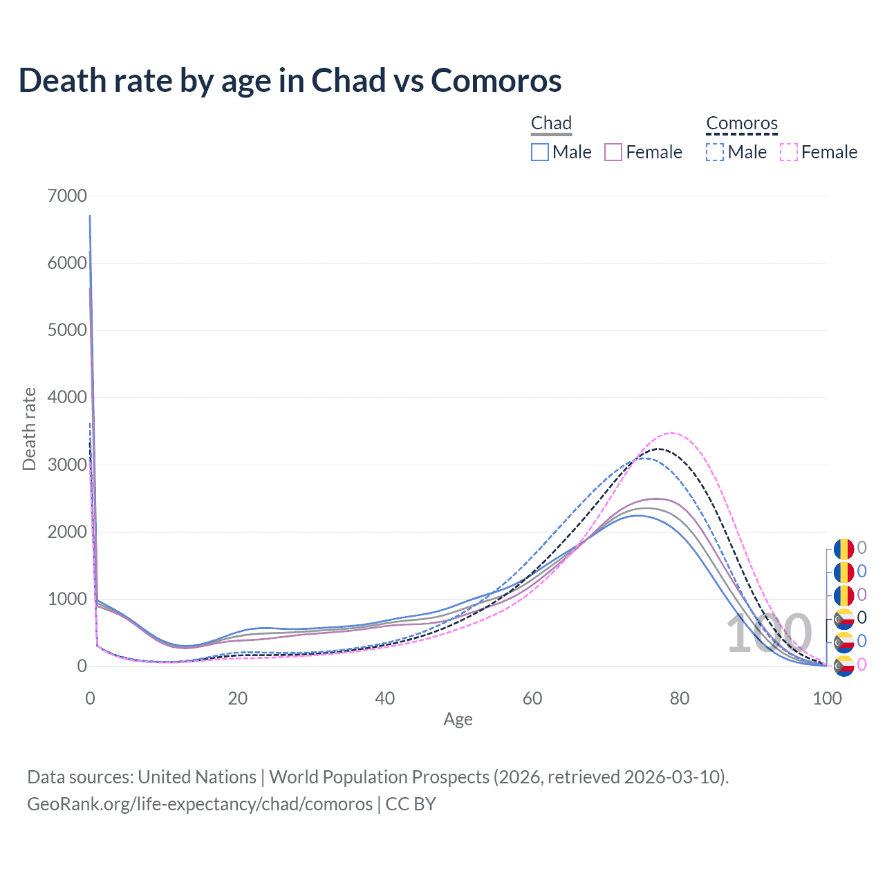 In Chad, the most common age of death is 0, compared to 0 in Comoros. The median age of death is 64.8 in Chad and 72.9 in Comoros, meaning only half of each cohort is expected to live past that age.