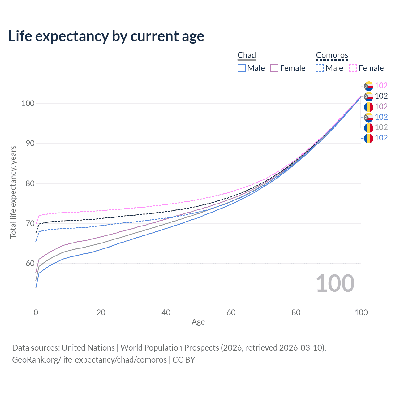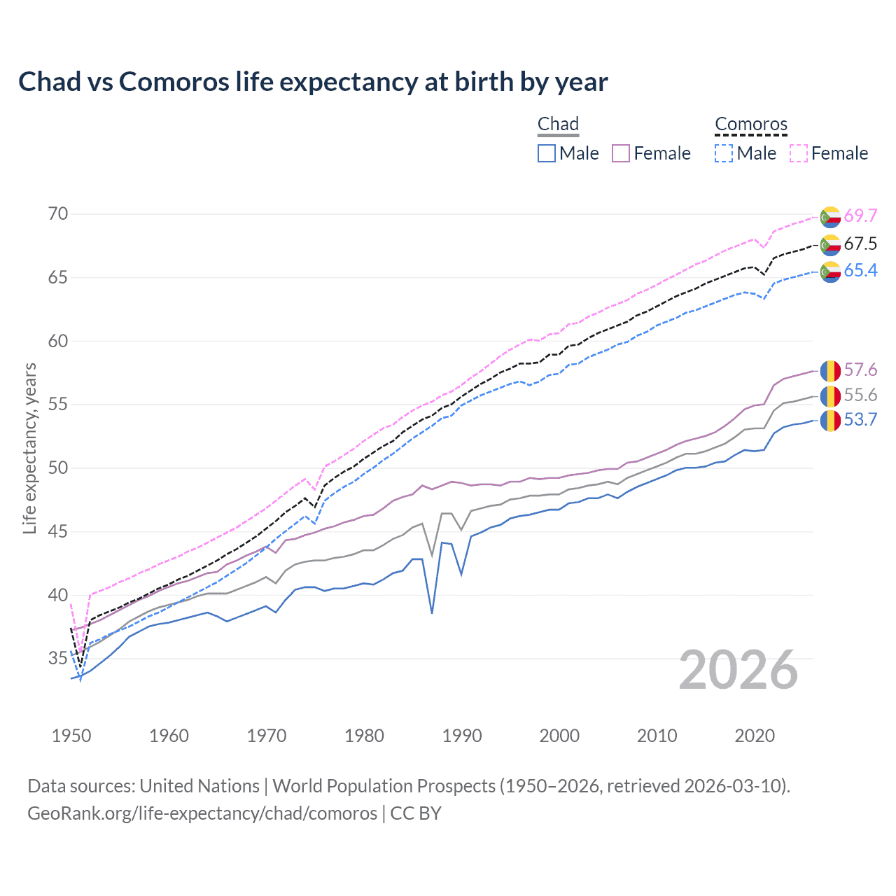The average life expectancy at birth is 55.6 years in Chad vs 67.5 in Comoros. Chad is ranked 196/197 by life expectancy, and Comoros is 158/197. In Chad, the life expectancy is 53.7 years for males and 57.6 years for females. In Comoros, it's 65.4 years for males and 69.7 years for females.