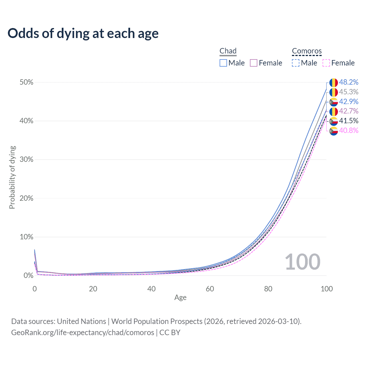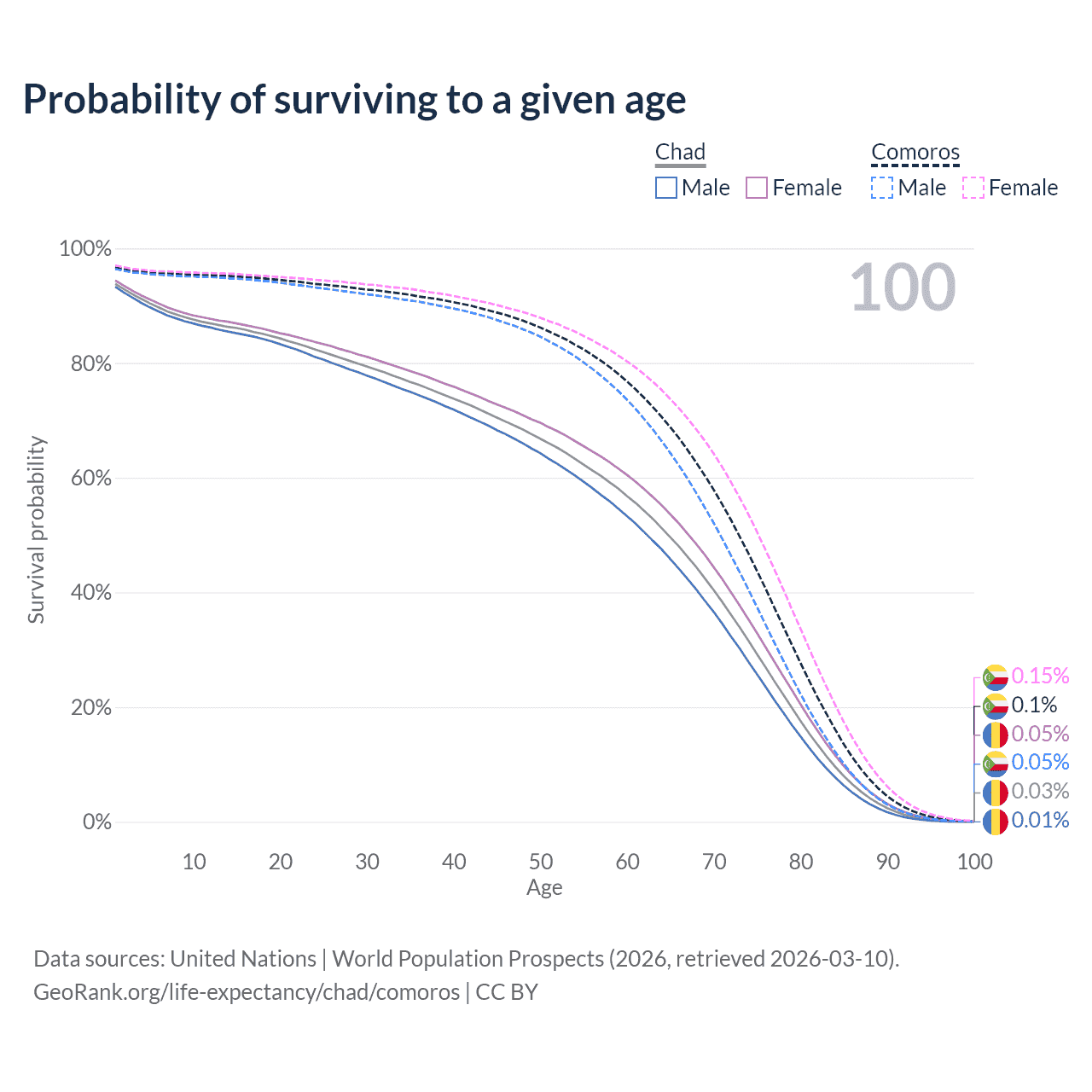 This life expectancy calculator shows the odds of living to 100, 95, 90, and below based on current age for both males and females in Chad and Comoros, along with mean and median age of death. The calculations are based on the 2026 life tables (actuarial tables) from the UN World Population Prospects.