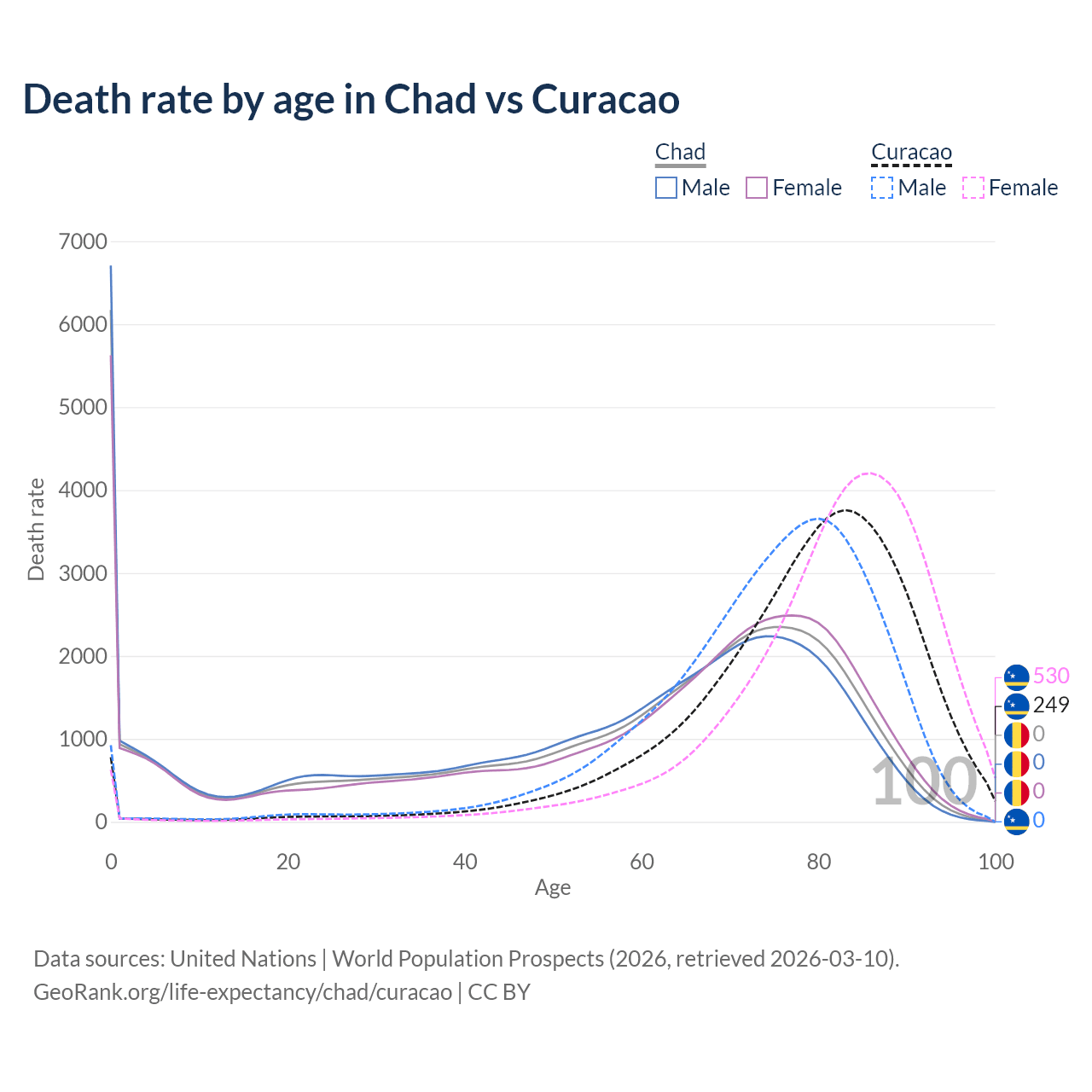 In Chad, the most common age of death is 0, compared to 83 in Curacao. The median age of death is 64.8 in Chad and 80.4 in Curacao, meaning only half of each cohort is expected to live past that age.