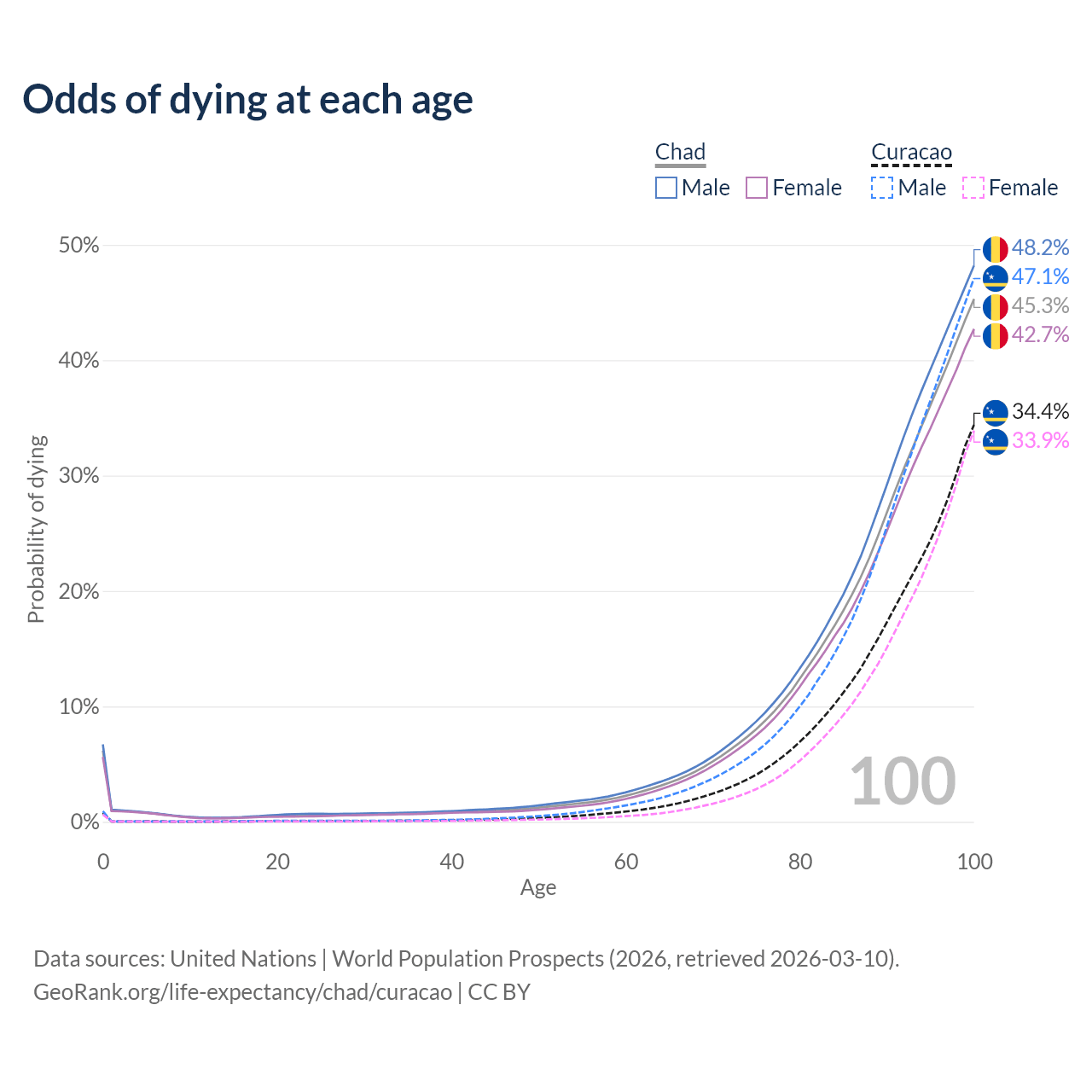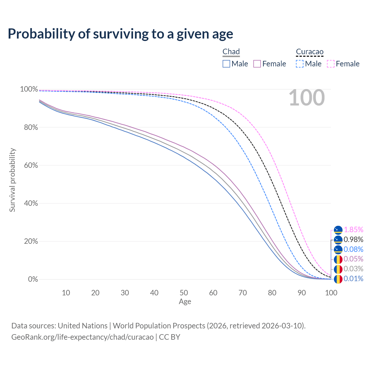 This life expectancy calculator shows the odds of living to 100, 95, 90, and below based on current age for both males and females in Chad and Curacao, along with mean and median age of death. The calculations are based on the 2026 life tables (actuarial tables) from the UN World Population Prospects.
