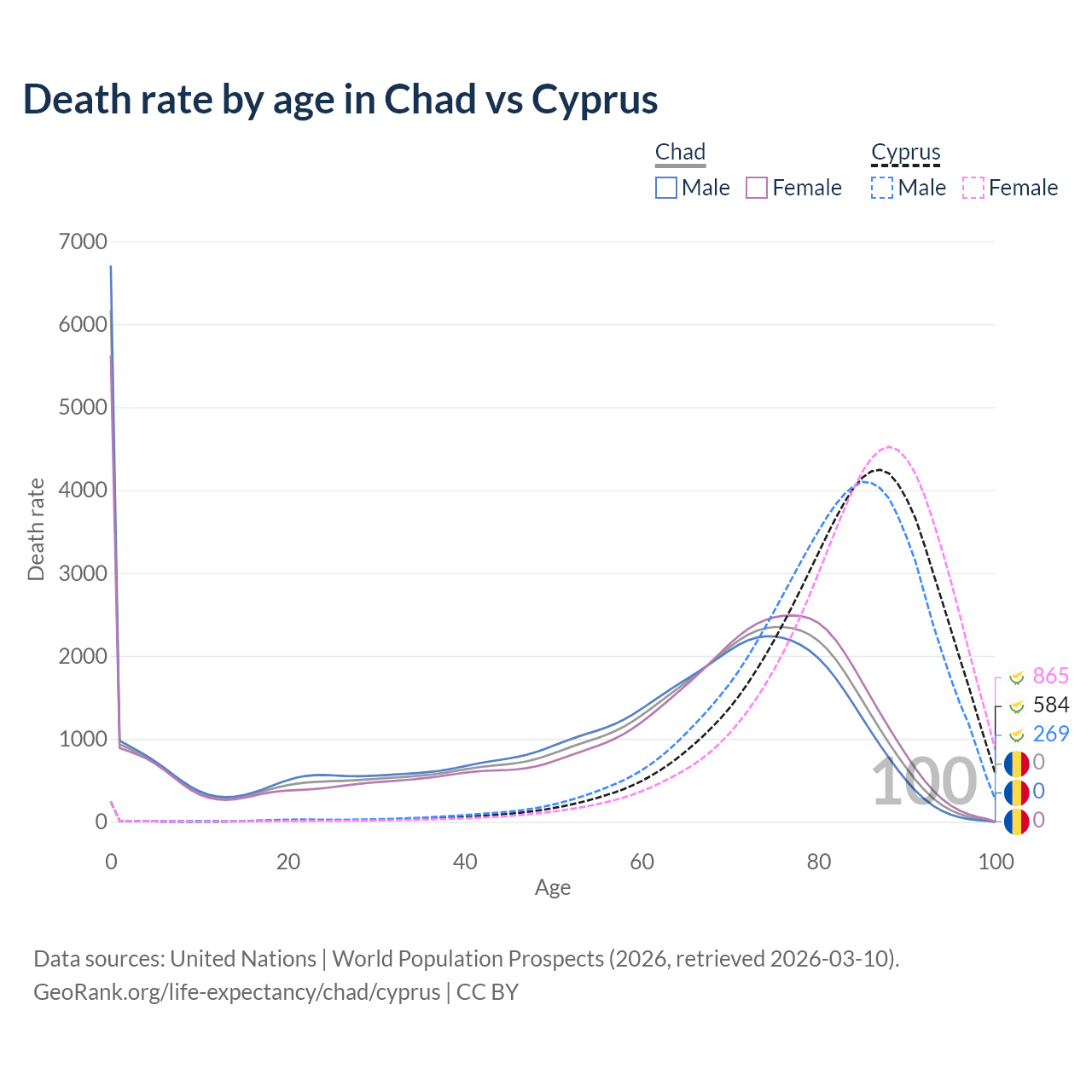 In Chad, the most common age of death is 0, compared to 87 in Cyprus. The median age of death is 64.8 in Chad and 84.3 in Cyprus, meaning only half of each cohort is expected to live past that age.