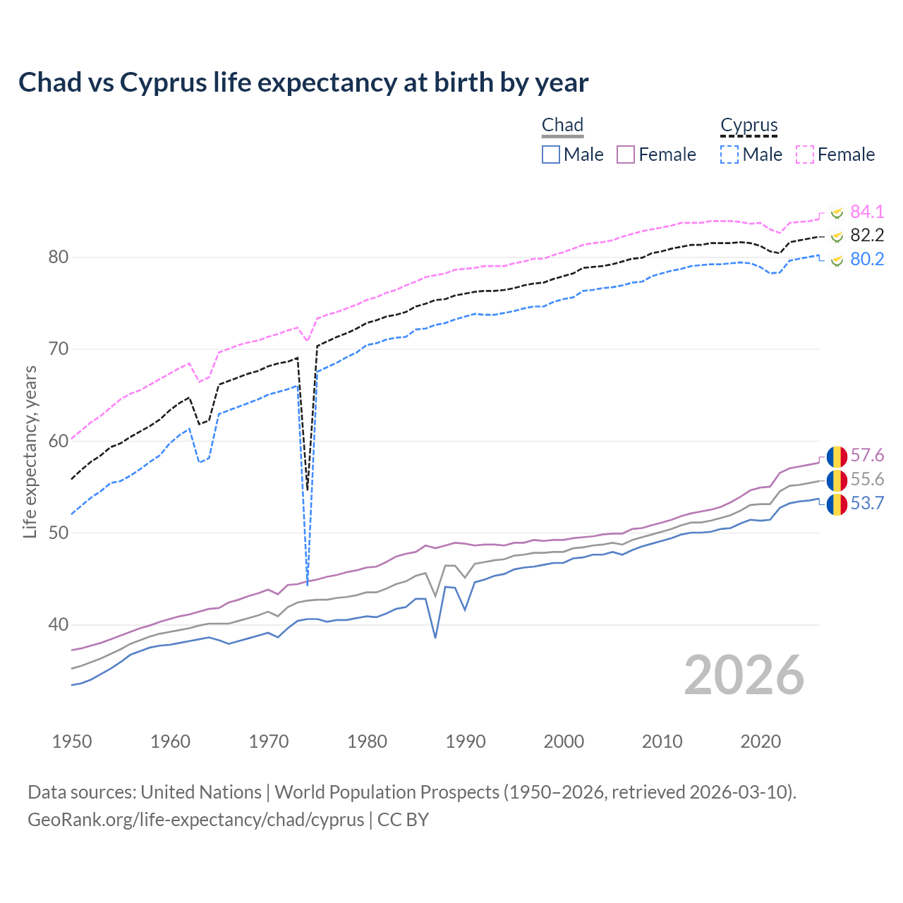 The average life expectancy at birth is 55.6 years in Chad vs 82.2 in Cyprus. Chad is ranked 196/197 by life expectancy, and Cyprus is 32/197. In Chad, the life expectancy is 53.7 years for males and 57.6 years for females. In Cyprus, it's 80.2 years for males and 84.1 years for females.