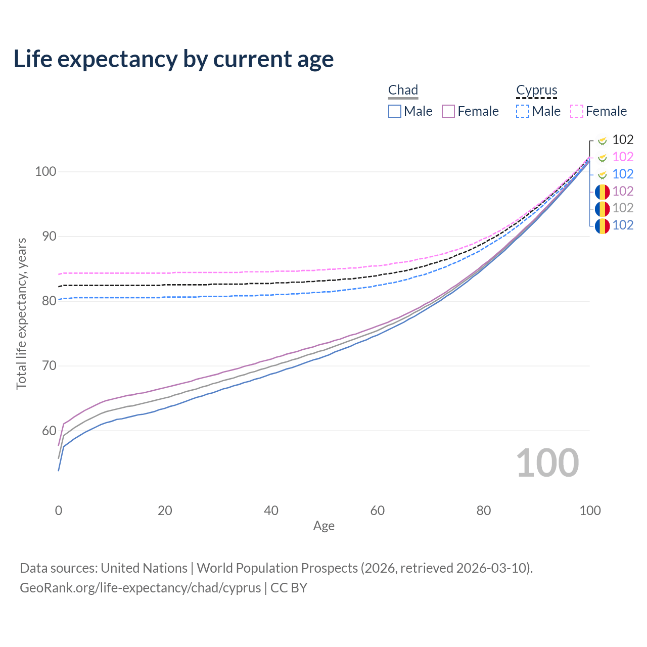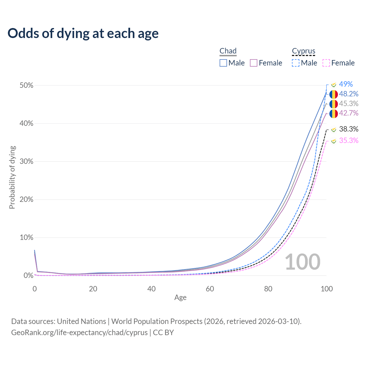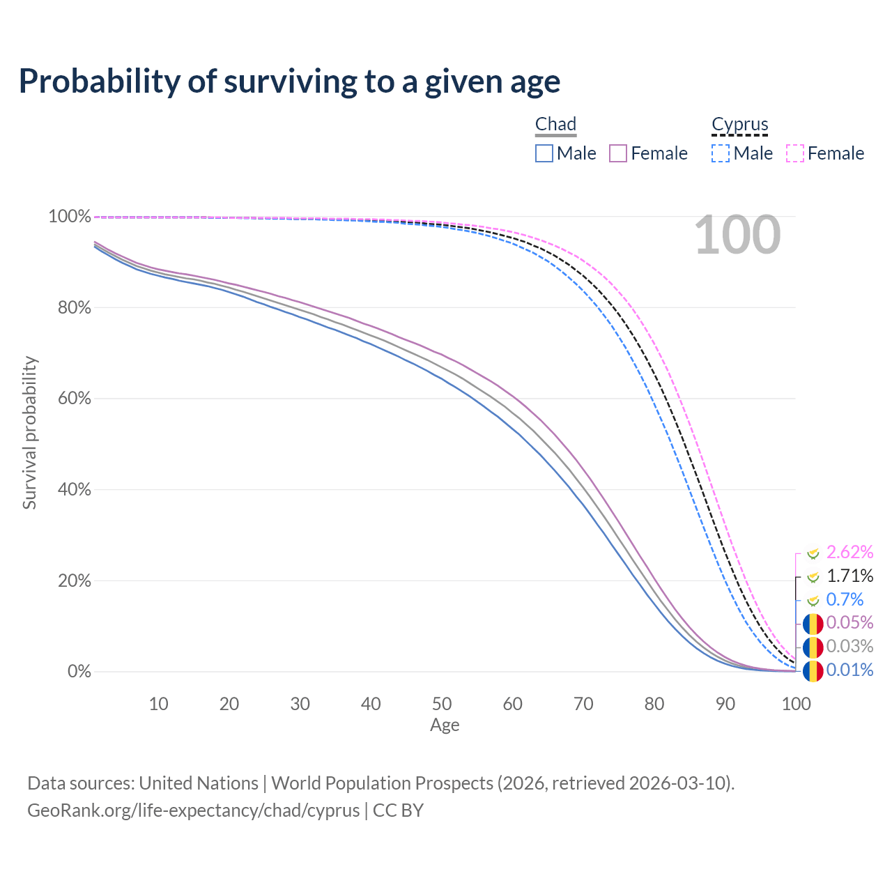 This life expectancy calculator shows the odds of living to 100, 95, 90, and below based on current age for both males and females in Chad and Cyprus, along with mean and median age of death. The calculations are based on the 2026 life tables (actuarial tables) from the UN World Population Prospects.
