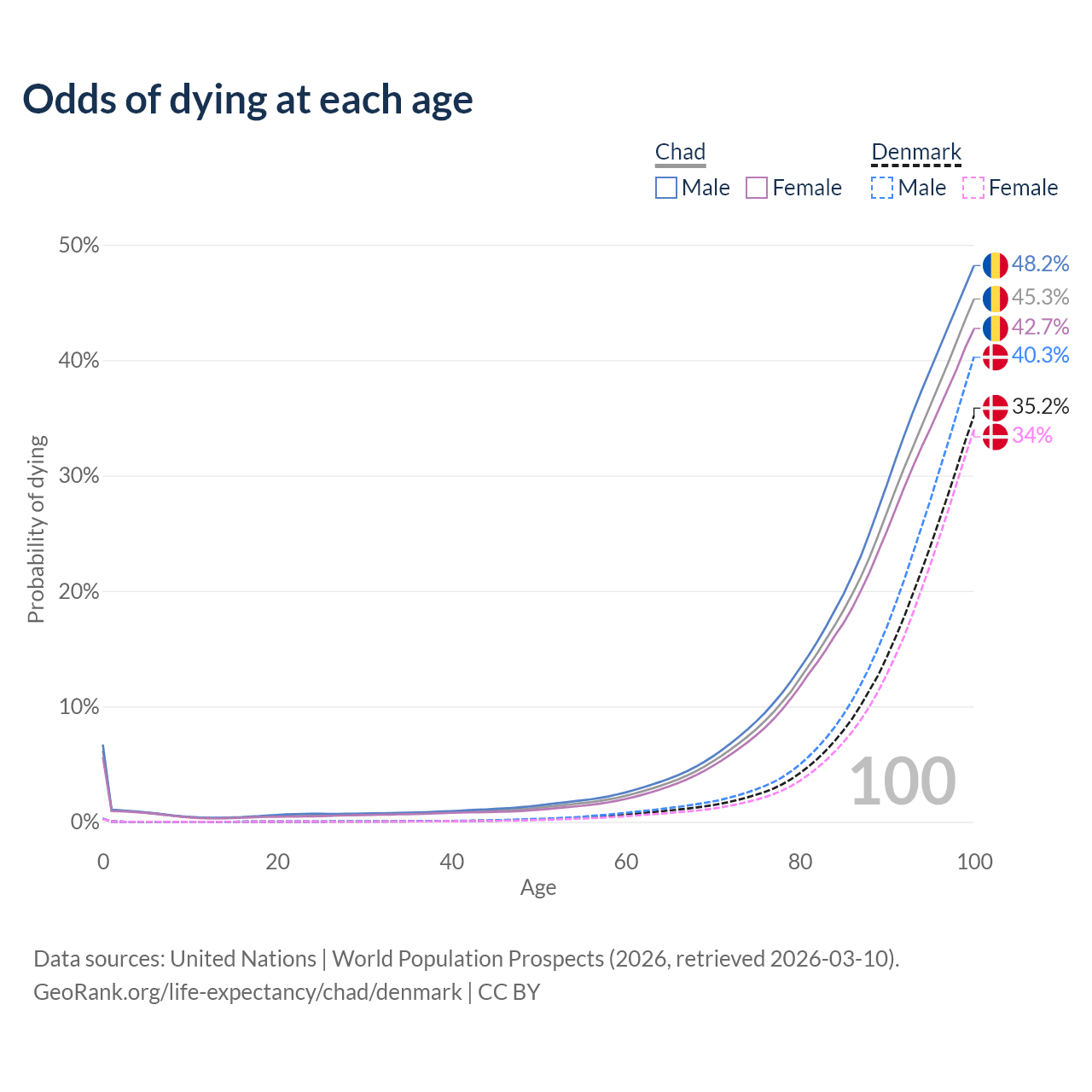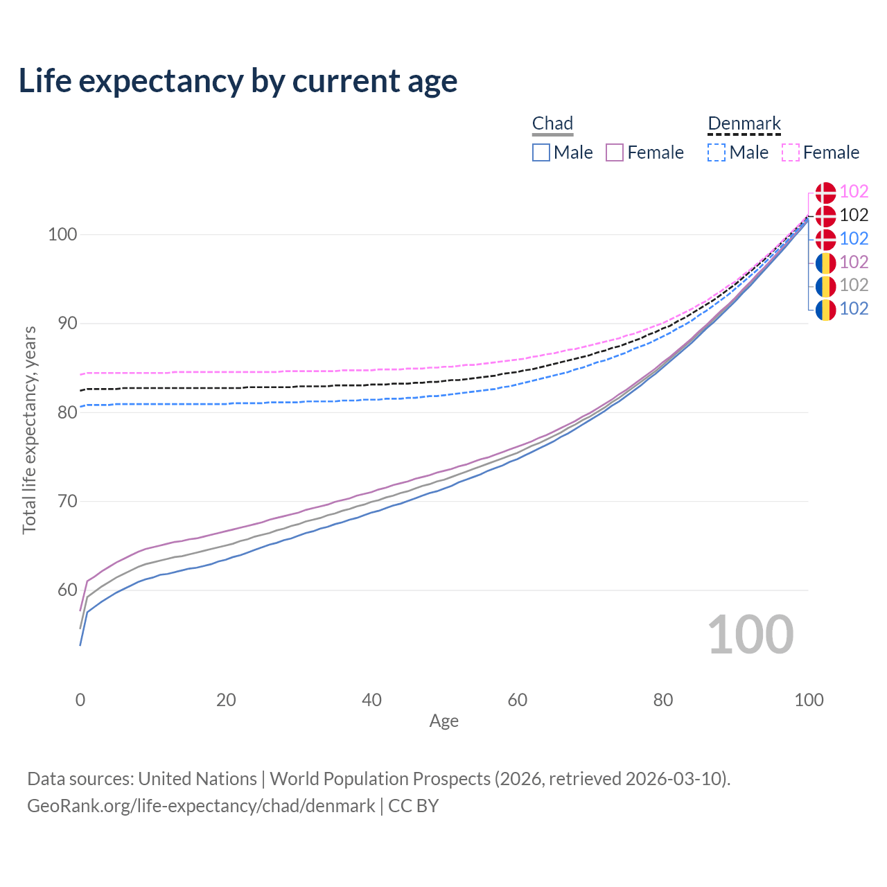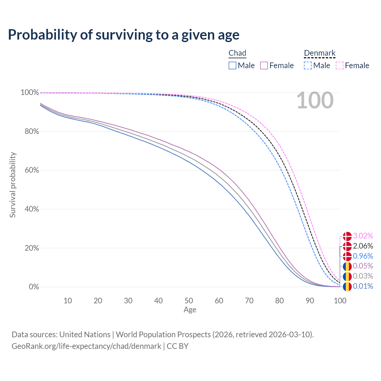 This life expectancy calculator shows the odds of living to 100, 95, 90, and below based on current age for both males and females in Chad and Denmark, along with mean and median age of death. The calculations are based on the 2026 life tables (actuarial tables) from the UN World Population Prospects.