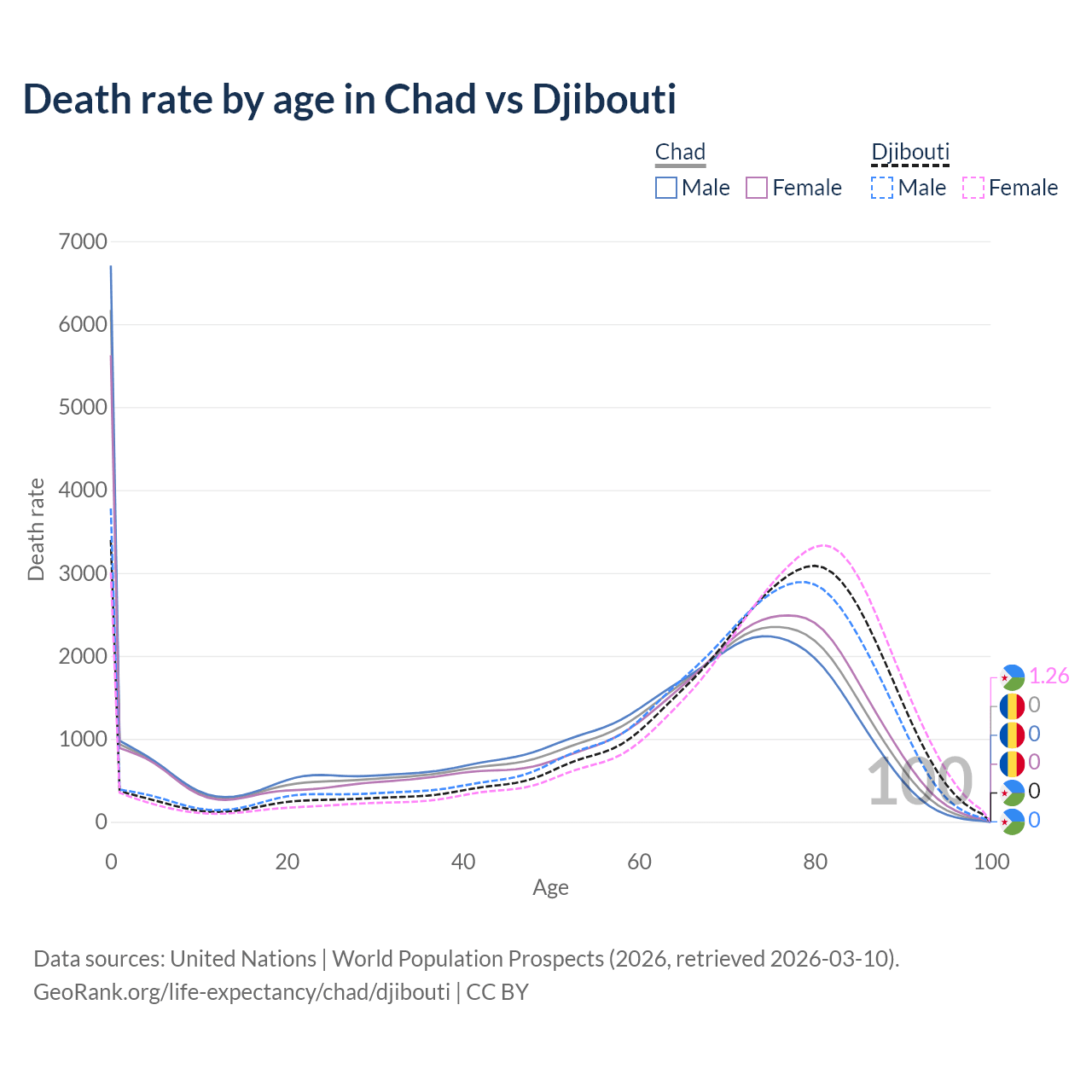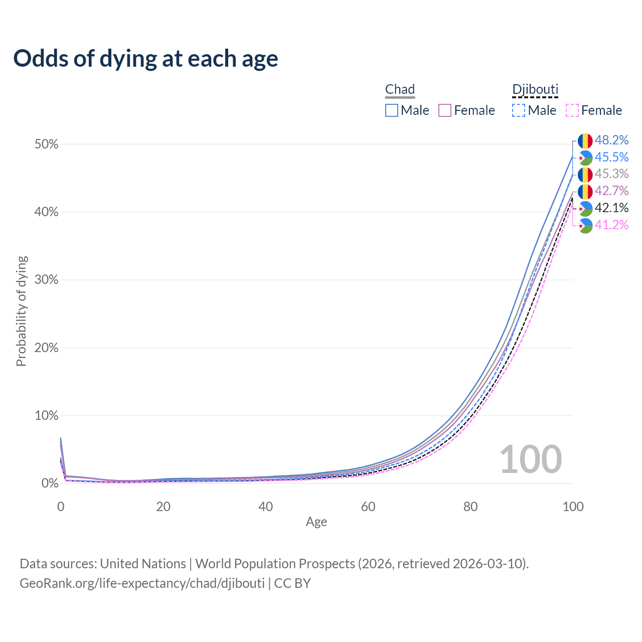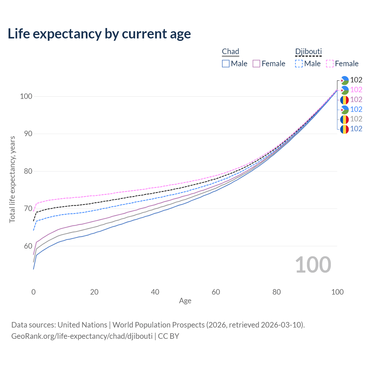 This life expectancy calculator shows the odds of living to 100, 95, 90, and below based on current age for both males and females in Chad and Djibouti, along with mean and median age of death. The calculations are based on the 2026 life tables (actuarial tables) from the UN World Population Prospects.
