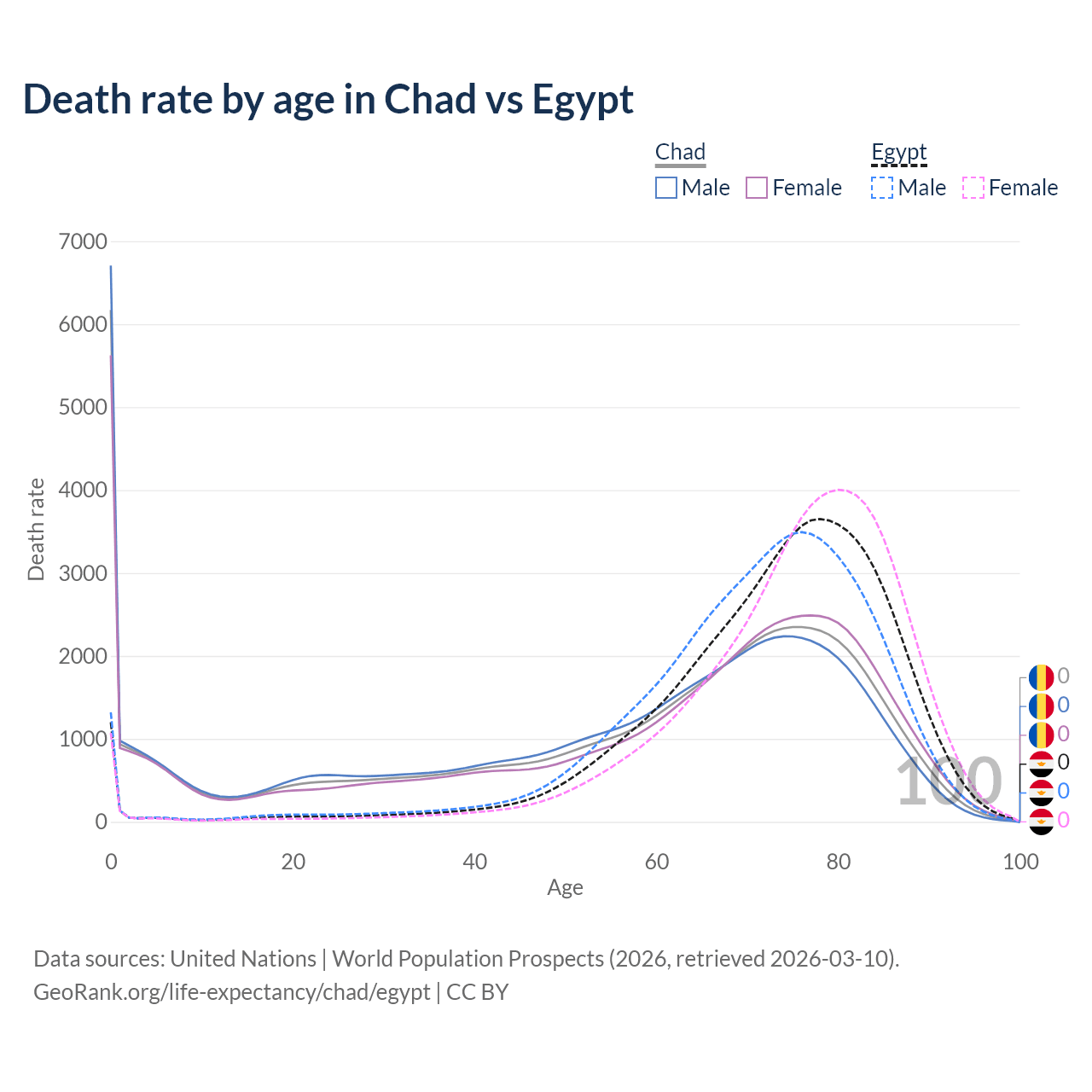 The average life expectancy at birth is 55.6 years in Chad vs 72.2 in Egypt. Chad is ranked 196/197 by life expectancy, and Egypt is 122/197. In Chad, the life expectancy is 53.7 years for males and 57.6 years for females. In Egypt, it's 70 years for males and 74.4 years for females.